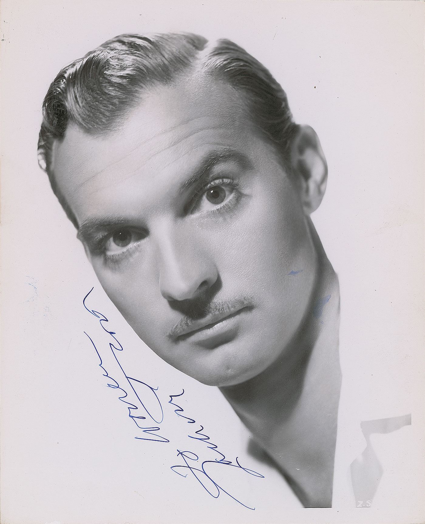American actor (1914–1965) who is most notable for playing villains and 'mystery men'; he is best remembered for his roles in The Mask of Dimitrios, The Southerner, and Mildred Pierce. Vintage glossy 8.25 x 10 studio portrait of Scott in a close-up pose, vertically signed and inscribed in fountain pen, "To Warren, Zachary Scott.” In fine condition, with a small ink smudge on his left cheek.