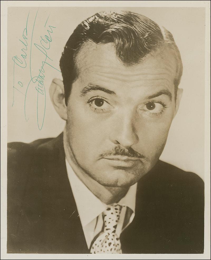 Vintage sepia glossy 8 x 10 photo, signed and inscribed vertically in green ballpoint “To Carlo, Zachary Scott.” Some scattered creases and surface marks, otherwise fine condition.
