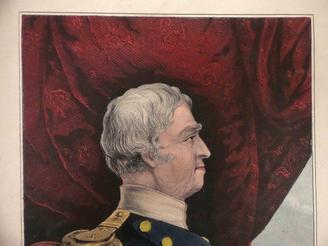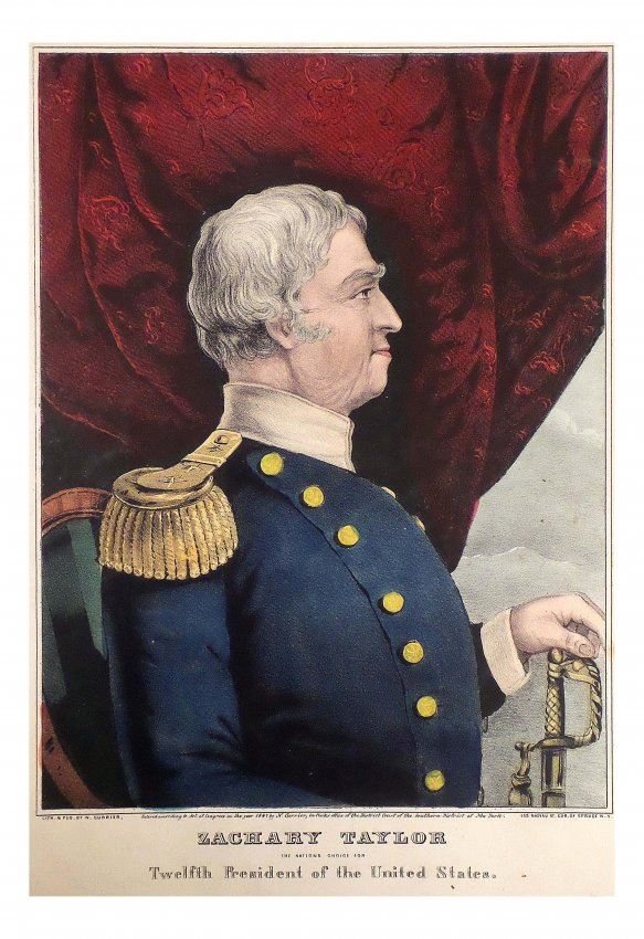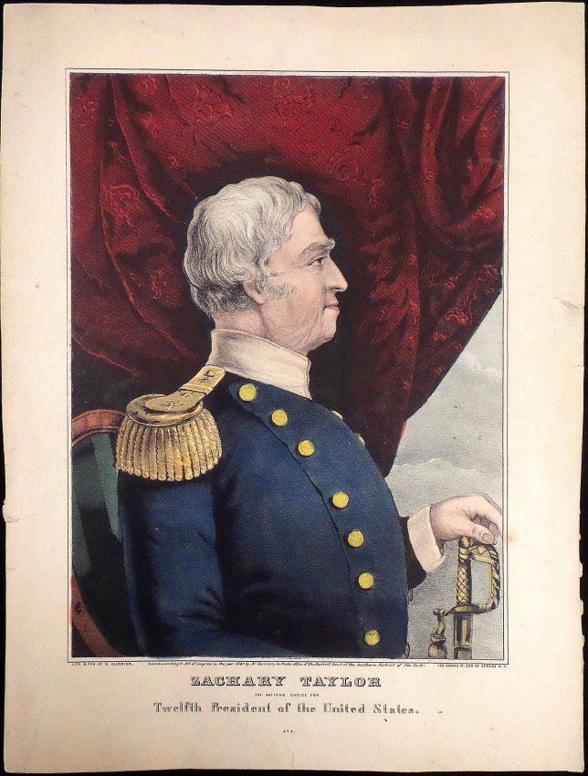 Hand-colored lithograph depicting General Taylor in a waist-length, 1/2-profile, pose wearing his military dress uniform. Imprinted at bottom "Zachary Taylor / The Nation's Choice For / Twelfth President of the United States." Published by Nathaniel Currier, 1847. [Image: 11-1/4" x 8-5/8"; Sheet 14-3/4" x 11-1/4"]. Light age-toning and minor margin defects including short tears and soiling.