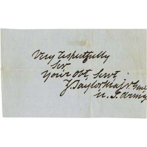<B>Zachary Taylor Clipped Signature,</B></I> "<I>Very Respectfully Sir Your obt Servt Z. Taylor, Major Genl U.S. Army</B></I>", 5" x 3", from a larger document. Smoothed folds, very fine condition. Accompanied by a 12-cent postage stamp bearing a likeness of the 12th president.<BR><BR><b>Shipping:</b> Flat Material, Small (<a target="_blank" href="http://www.heritageauctions.com/common/shipping.php">view shipping information</a>)