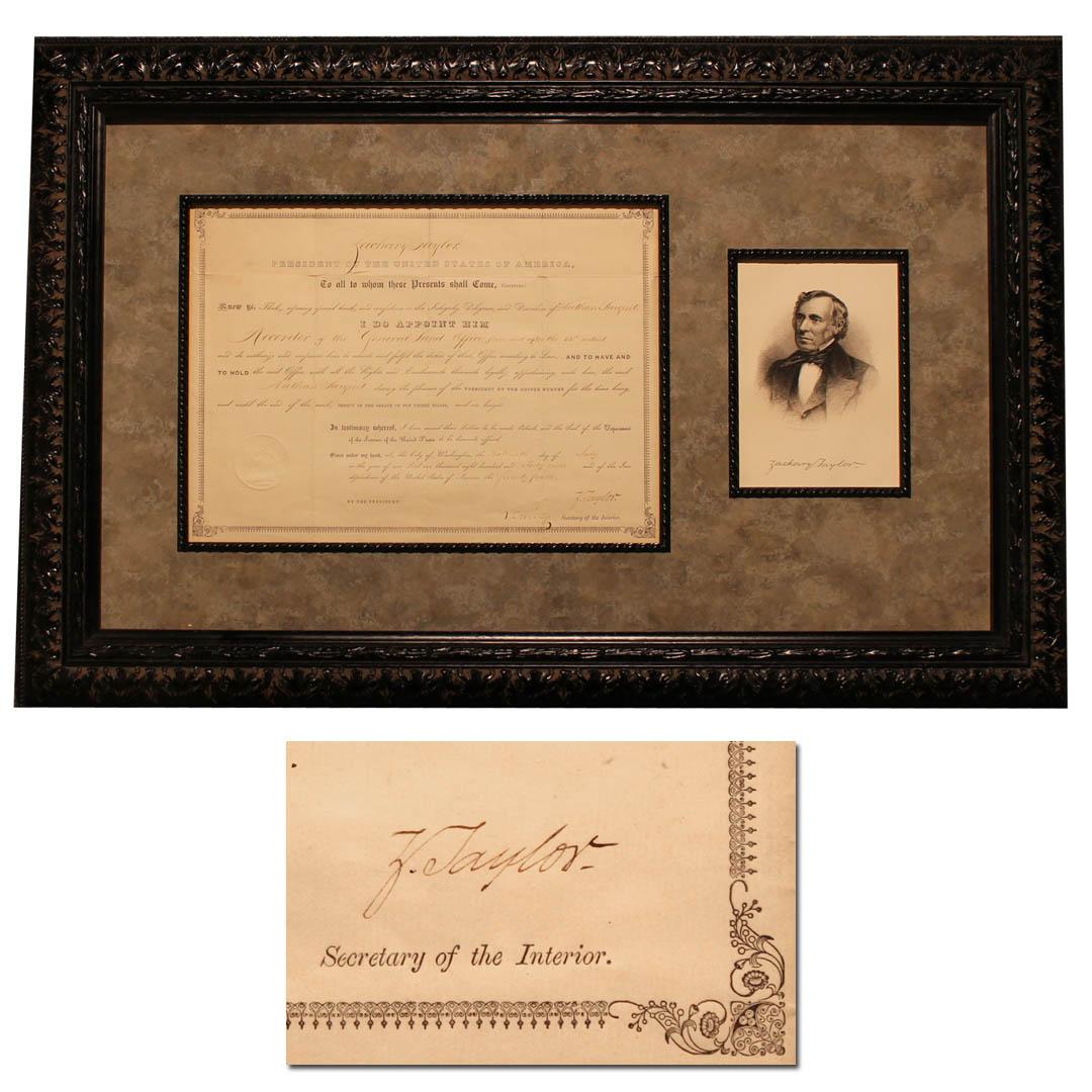 Official White House appointment signed by Zachary Taylor during his short presidency. Dated 16 July 1849, document appoints Nathan Sargent as Recorder of the General Land Office and bears a blindstamped United States seal to lower left corner. Nice, clear signature, ''Z. Taylor'' at document's conclusion. Document, which measures 14'' x 10'' has folds throughout, though none affecting signature. Black frame measures 31.5'' x 20.25'' with gray marble-patterned mat. Fine condition.