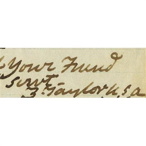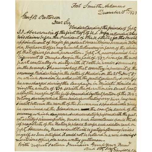 <B>Zachary Taylor Important Autograph Letter Signed</B></I>: Less than five years before his election as President, General Taylor writes a letter in favor of the promotion of a captain to major; this letter was quoted by President John Tyler in his message to the Senate promoting the captain!<BR><BR>Signed: "<I>Z Taylor</B></I>", one page, 7.75" x 9.75". Fort Smith, Arkansas, December 15, 1843. To General Robert Patterson. With integral leaf addressed by Taylor to: "<I>Genl. R. Patterson/Philadelphia</B></I>" In full: "<I> Dear Sir, Understanding the friends of Capt J. J. Abercrombie of the first Reg't of U.S. Infy intended to lay his claims before the President of the U. States, for the brevet appointment of Major for gallant & meritorious services in Florida, I beg leave to offer my humble testimony in favor of the claims of that officer for such promotion. Capt A accompanied his regiment to Tampa Bay in the fall of 1837, & was for the most part constantly on duty with it, both in winter & summer in the swamps and hammocks of that country, in pursuit of the enemy. Besides being in the battle of Okechobe sic on the 25th Decr, 37 on which occasion he acted with the greatest gallantry & coolness, he was charged during the Campaign in Middle Florida during the winter of 1839-40 with the operations in small boats, along the margin of the gulf bounded by that portion of the Territory, during which time besides penetrating every river, bay, creek, & inlet between the mouth of the Suwanee sic & Apalachicola rivers, he examined all the Islands near the coast, in search of the enemy, which dangerous & arduous duty he performed with the greatest ability & circumspection. Under such circumstances should the chief magistrate of the nation be pleased to confer such additional rank on Capt. Abercrombie, I have no doubt it will be gratifying to many besides myself, as I am satisfied it could not be bestowed on a more deserving & meritorious officer, or a more worthy gentleman. With respect & esteem I remain General your friend and obt srvt.</B></I>"<BR><BR>Zachary Taylor's decisive victory at Okeechobee on December 25, 1837, marked the turning point in the Second Seminole War and paved the way for General Taylor's political career. On April 4, 1838, President Van Buren sent to the U.S. Senate his nomination of "Colonel Zachariah sic Taylor, of the 1st Regiment of Infantry, to be brigadier-general by brevet, to take rank the 25th of December, 1837, for distinguished services on that day in the battle of the Kissimme sic , in Florida, with the Seminole Indians." Colonel Taylor's official report of the battle of Okeechobee to the Adjutant General in Washington was referred to by the War Department as "the battle with the Seminole Indians near the Kissimmee River." In May, 1838, Taylor was the commander of all forces in Florida; in April, 1840, at his own request, he was relieved of that post. After a year in Baton Rouge, Louisiana, he became commander of the Second Department, Western Division, at Fort Smith, Arkansas, in May, 1841. This letter was written from Fort Smith two years later.<BR><BR><B>Robert Patterson</B></I> (1792-1881) fought in the War of 1812, rising from Captain to Colonel in the 2nd Pennsylvania Militia before joining the U.S. Army. After the war, he became a businessman. A Jacksonian Democrat, he became influential in Pennsylvania politics and extended his business interests to the West and South. Patterson was commissioned Major General of Volunteers in the Mexican War and the Civil War. His daughter, Mary Engle Patterson (1818-1874) was married to John J. Abercrombie.<BR><BR><B>John J. Abercrombie</B></I> (1798-1877) served as Adjutant in the 1st Infantry from 1825-1833 and was made Captain in 1836. After serving in the Second Seminole War, he was engaged in frontier duty in the West. At the time of this letter, he was stationed at Fort Atkinson, Iowa. From 1846-1847, in the Mexican War, Abercrombie served as aide-de-camp to his father-in-law, General Robert Patterson, and was promoted from Major to Lieutenant Colonel. In the Civil War, Brigadier General Abercrombie commanded troops under General Patterson in the Shenandoah Valley and at the Battle of Falling Waters.<BR><BR><B>Quoting from this very letter,</B></I> on January 24, 1844, less than six weeks after this letter was written, President Tyler sent the following to the U.S. Senate: "I nominate to the Senate Captain J. J. Abercrombie, of the 1st Regiment U. S. Infantry, to be major by brevet, for gallant and meritorious services in Florida, to rank as such from the 25th December, 1837, the day on which was fought the battle of Okeechobee, on which occasion 'he acted,' in the language of his commander, Brevet Brigadier-General Taylor, 'with the greatest gallantry and coolness.'" This full page letter is in very fine condition with a minute tear in the blank upper left corner. Included are photographs of Patterson and Abercrombie. Rarely does a collector get the chance to buy a letter penned by a future U.S. President, with great military content, read by and quoted by another U.S. President in an official message to the U.S. Senate! It would be a wonderful addition to a military or presidential collection. <I>From the Gary Grossman Collection.</B></I><BR><BR><b>Shipping:</b> Flat Material, Small (<a target="_blank" href="http://www.heritageauctions.com/common/shipping.php">view shipping information</a>)