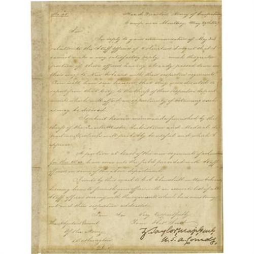 <B>Zachary Taylor Manuscript Letter Signed</B></I> "<I>Z. Taylor</B></I>" as major general, one page, 7" x 9.5", Headquarters, Army of Occupation, Camp near Monterey, May 29, 1847, addressed to The Adjutant General of the Army in Washington, DC. Three months after his greatest military battle at Buena Vista, Taylor writes: "<I>In reply to your communication... relative to the Staff Officers of Volunteers, I regret that I cannot make a very satisfactory reply - much the greater portion of those officers having already passed down on their way to New Orleans with their respective regiments. You will have seen however that they were directed to report from that city to the Chiefs of their respective departments which will afford an opportunity of retaining such as may be desired. I submit however memoranda furnished by the chiefs of the Quarter Master, Subsistence and Medical departments, which will probably be useful and which I approve. A portion at least of the new regiments of volunteers for the war have come into the field provided with Staff officers in some of the above departments. I write by this mail to Col. Churchill in New Orleans desiring him to furnish your office with an accurate list of all Staff Officers serving with the regiments which he is mustering out and their respective addresses</B></I>". Boldly signed by Taylor adding "<I>Majr Genl</B></I>" and "<I>U.S.A. Comdg</B></I>". Light scattered foxing, toning at the edges from mounting remnants on the verso barely detract from this fine letter.<BR><BR><b>Shipping:</b> Flat Material, Small (<a target="_blank" href="http://www.heritageauctions.com/common/shipping.php">view shipping information</a>)