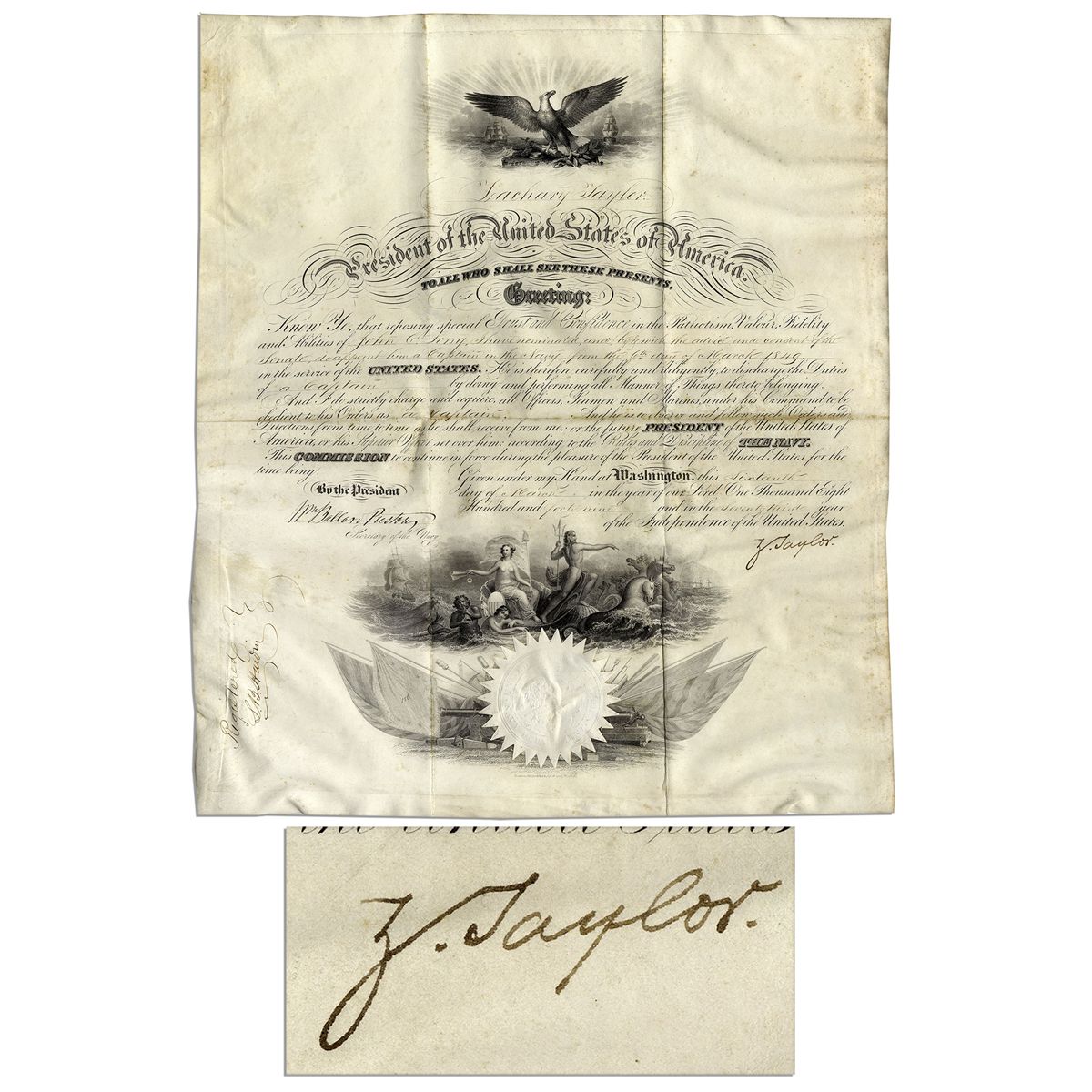 Zachary Taylor naval appointment signed as President, dated 16 March 1849. Document appoints a John C. Song as a ''Captain in the Navy''. Partially printed document is signed ''Z. Taylor'' with various naval emblems flanking the text. Countersigned by Secretary of the Navy William Ballard Preston. A blindstamped Department of the Navy seal is affixed to the bottom half, atop an etched nautical scene. Measures 15.5'' x 17.25''. Some creasing and toning; very good condition.