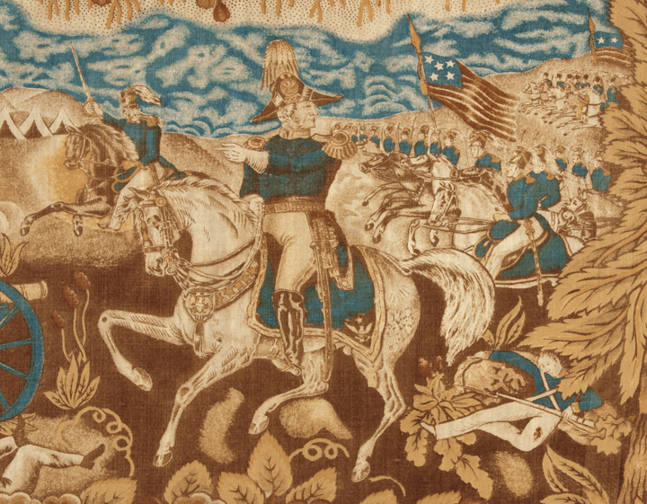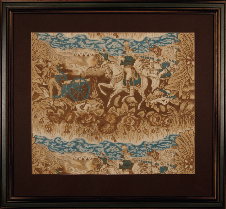 This superb quality, colorful printed Political Campaign Textile was produced as the Whig nominated candidate for the Presidency. Measuring a large 23" x 19" (by sight) and nicely framed to 32.25” x 29.75” the glass removed. It is listed in the reference “Threads of History” as item number 198, as listed on page 123. The textile has colorful tan, brown and blue printing and is in bright, clean condition. The theme depicting the American Mexican War hero, General Zachary Taylor, leading his troops into battle during the Mexican War. Taylor is seated upon his white horse as Mexican artillery soldiers fade as he approaches. In 1846 Taylor was appointed major general and he received the thanks of Congress and in 1849 resigned from the army due to his Whig nomination for the Presidency. The superior condition with its bright, rich colors is simply the finest example we have ever seen. This museum quality example is very impressive and ready for display.
