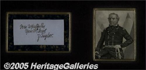<B>Zachary Taylor Signature</B></I> His signature, "Very respectfully Your Obt. Sevt. Z. Taylor," on a 3/5" x 1.75" slip of blue paper. Boldly signed on a crisp, clean sheet. Ornately matted with an engraving of the Mexican War Hero and President. <I>From the collection of Bradley O'Leary.</B></I> <I>Accompanied by COA from PSA/DNA.</B></I>