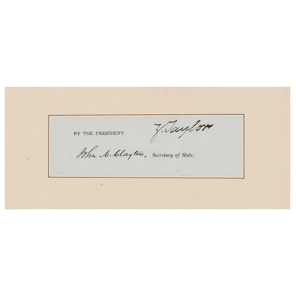 Scarce ink signature as president, "Z. Taylor,‰Û on an off-white 5.75 x 1.75 slip clipped from a document, also signed by Secretary of State John M. Clayton. Professionally inlaid into an 8.5 x 7 sheet and in fine condition. A bold, choice example of one of Zachary Taylor's presidential autographs, especially scarce given his short 16-month tenure in the White House.