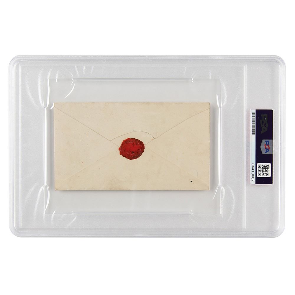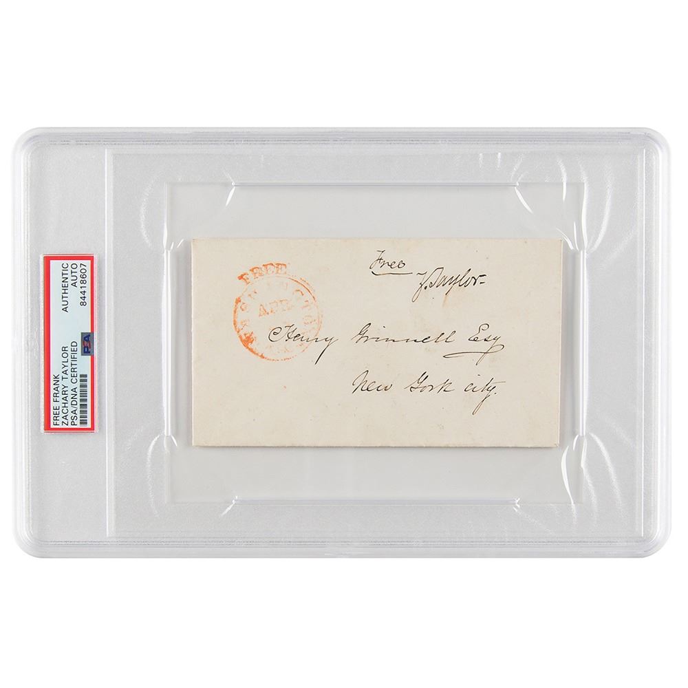 Hand-addressed and free-franked mailing panel, 5.5 x 3, addressed by Zachary Taylor to "Henry Grinnell Esq., New York City," and franked in the upper right as president, "Free, Z. Taylor." Retains the original red wax seal on the reverse. In fine condition. Taylor received franking privileges upon his ascent to the presidency, and passed away before his term ended. Given his short tenure in the White House, presidential autographs by Taylor are especially scarce. Encapsulated in a PSA/DNA authentication holder.