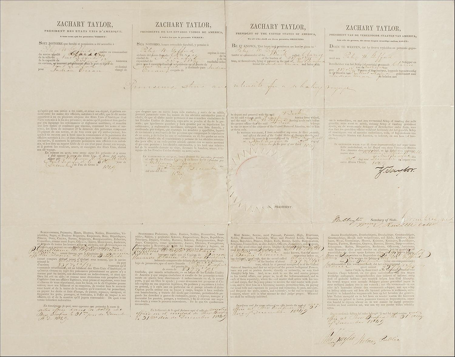 Rare partly-printed DS as president, one page, 21.5 x 16.75, December 31, 1849. Four language ship’s paper issued to “Peleg W. Grifford, master or commander of the Bark called Clarice…lying at present in the port of New Bedford bound for the Indian Ocean and laden with provisions, stores, and utensils for a whaling voyage.” Signed in the right panel by Taylor and countersigned by Secretary of State John M. Clayton. In very good condition, with partial separations along intersecting folds, a couple small pinholes of paper loss along folds, mirroring of seal from folding, and some scattered light toning. The white paper seal is crisp and intact. Taylor presidential documents are uncommon, and this one made more so by its desirable whaling-related content.