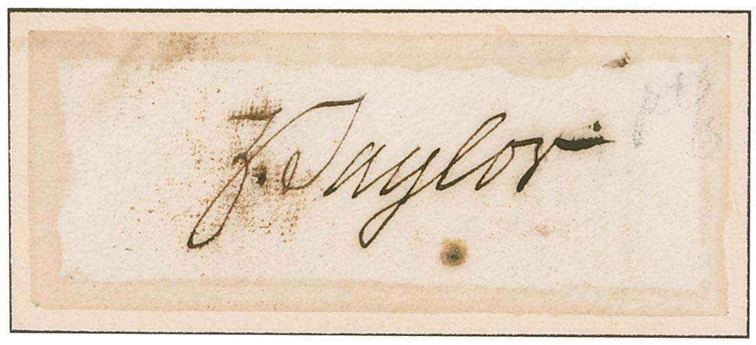 Ink signature, “Z. Taylor,” on an off-white 2.25 x .75 slip. Slip has been professionally inlaid to a 7 x 6.5 off-white sheet. Some scattered light soiling and stray ink marks over beginning of signature, otherwise fine condition.