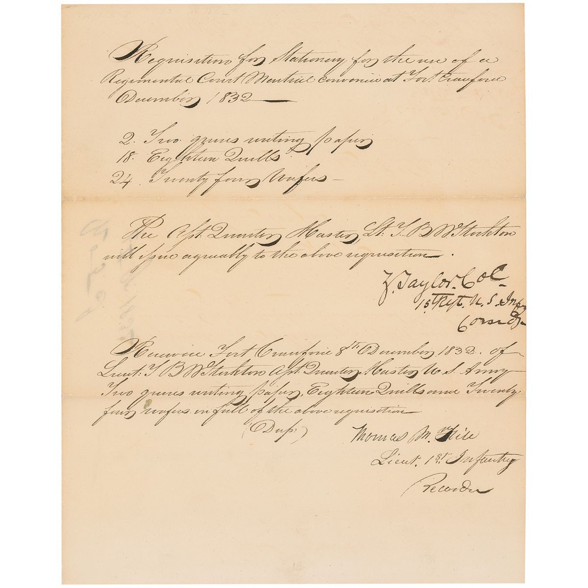 Manuscript DS, signed “Z. Taylor, Col. 1st Regt. U.S. Inf. Comdr.,” one page, 7.75 x 9.75, December, 1832. Request for stationery and writing supplies at Fort Crawford. In part: “Requisition for Stationery for the use of a Regimental Court Martial convened at Fort Crawford December 1832—2. Two quires writing paper, 18. Eighteen Quills, 24. Twenty four wafers—The Capt. Quarter Master, Lt. B. W. Stockton will issue agreeably to the above requisition,” signed by Taylor with his rank and title. Below, a 1st Infantry lieutenant confirms receipt of the order on December 8, 1832. In fine condition, with two horizontal folds, some show-through from docketing on reverse, light scattered toning, and slight mirroring to ink. Taylor frequently bemoaned the incompetence of the citizen militia units that he commanded in comparison to the superb discipline and unity of his Indian foes.