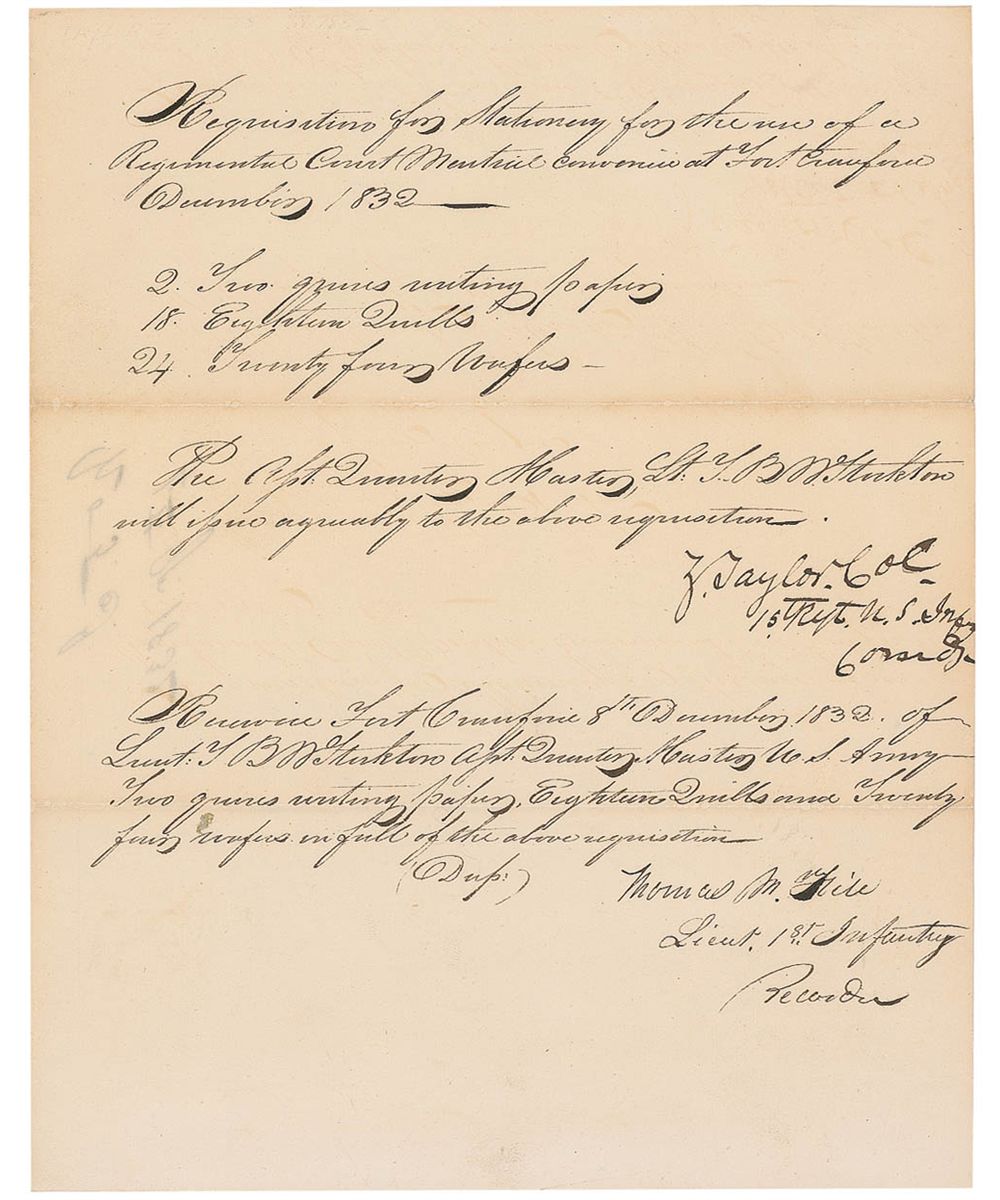 Manuscript DS, signed “Z. Taylor, Col., 1st Regt. U.S. Inf Comdr,” one page, 8 x 9.75, December 1832. Request for stationery and writing supplies at Fort Crawford. In part: “Requisition for Stationery for the use of a Regimental Court Martial convened at Fort Crawford December 1832— 2. Two quires writing paper, 18. Eighteen Quills, 24. Twenty four wafers—The Capt. Quarter Master, Lt. B. W. Stockton will issue agreeably to the above requisition,” signed by Taylor with his rank and title. Below, a 1st Infantry lieutenant confirms receipt of the order on December 8, 1832. In fine condition, with a bit of mild toning and light show-through from docketing on reverse.
