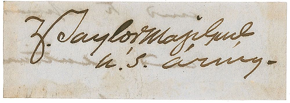 Ink signature, “Z. Taylor, Maj. Genl, U.S. Army,” on an off-white 2.75 x 1 clipped slip. Show-through from writing on reverse, and scattered toning, otherwise fine condition.