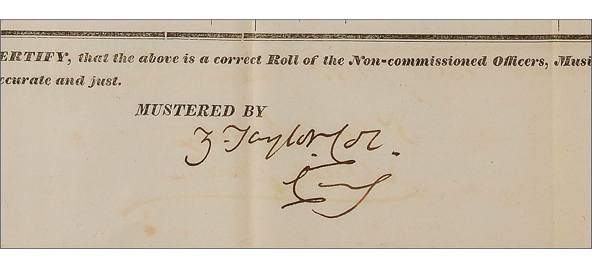 Partly-printed DS, signed “Z. Taylor, Col. Cmg,” one page, 21 x 16.5, May 1835. A “Muster Roll of Non-Commissioned Officers and Privates employed on extra duty, as Mechanics and Labourers, at Fort Crawford, M. T.” Muster roll lists 15 soldiers’ names, companies, and nature of their service including “Saw Mill,” “Turner,” “Quarrying Stone,” “Teamster,” and “Carpenter,” as well as their pay and length of service. Signed at the bottom by Taylor as commander, and countersigned by the assistant quartermaster. In fine condition, with vertical folds, one through a single letter of signature, a central horizontal fold, and some scattered light toning. Fort Crawford was an outpost of the United States Army located in Prairie du Chien, Wisconsin, during the 19th Century. The army's occupation of Prairie du Chien actually spanned the lifetime of two fortifications, both of them named Fort Crawford. A particularly clean, bright example boasting a crisp and bold signature.