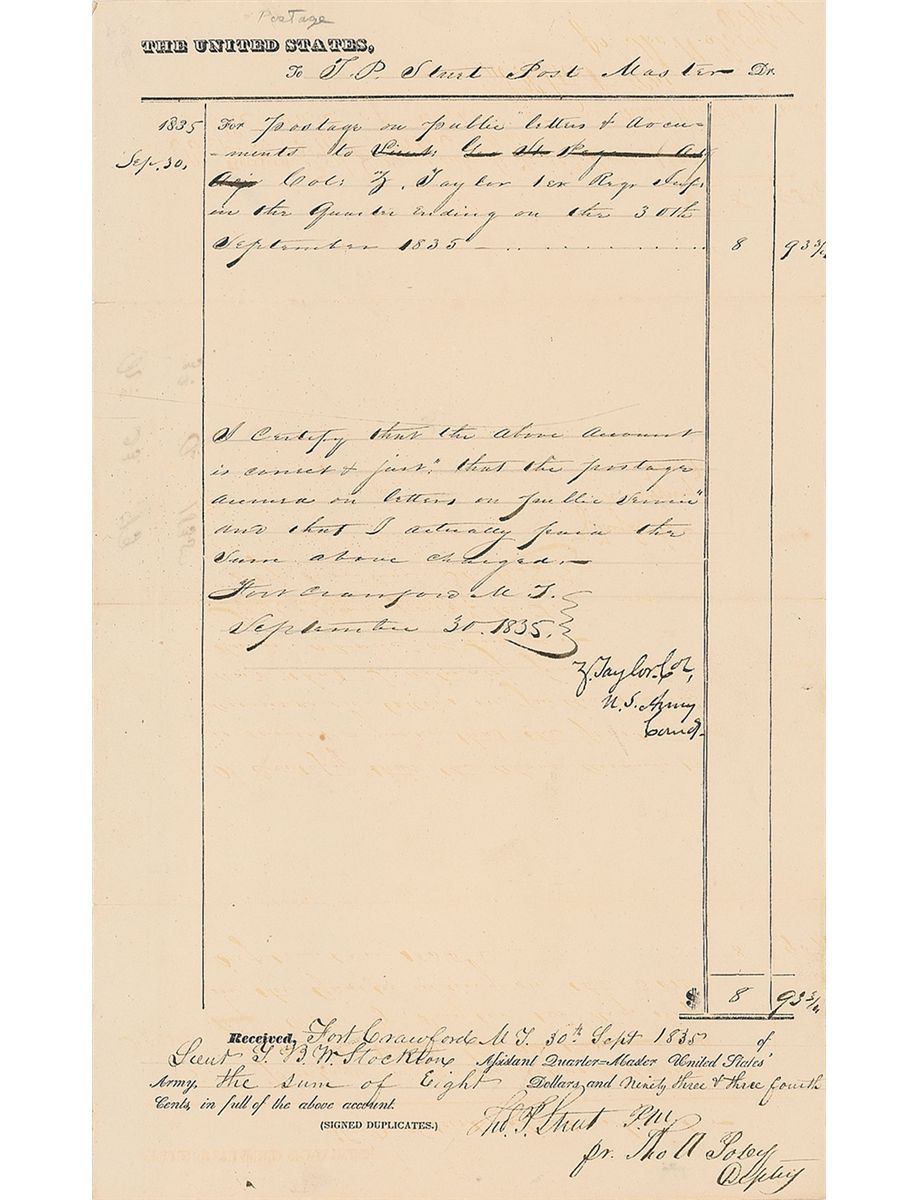 Uncommon manuscript DS, signed “Z. Taylor Col., U.S. Army Comd.,” one page, 8 x 13, September 30, 1835. Document regarding the postage account for public letters and documents sent from Wisconsin’s Fort Crawford for the quarter ending September 30, 1835. Taylor attests to the accounting at the top of the document, written in another hand, “that the postage accrued on letters on public service and that I actually paid the sum above charged.” In fine, clean condition, with slight edge separations along three horizontal folds, a small pencil notation to top, and some slight mirroring of ink. A much more uncommon document from Taylor’s time at Fort Crawford than usually seen.