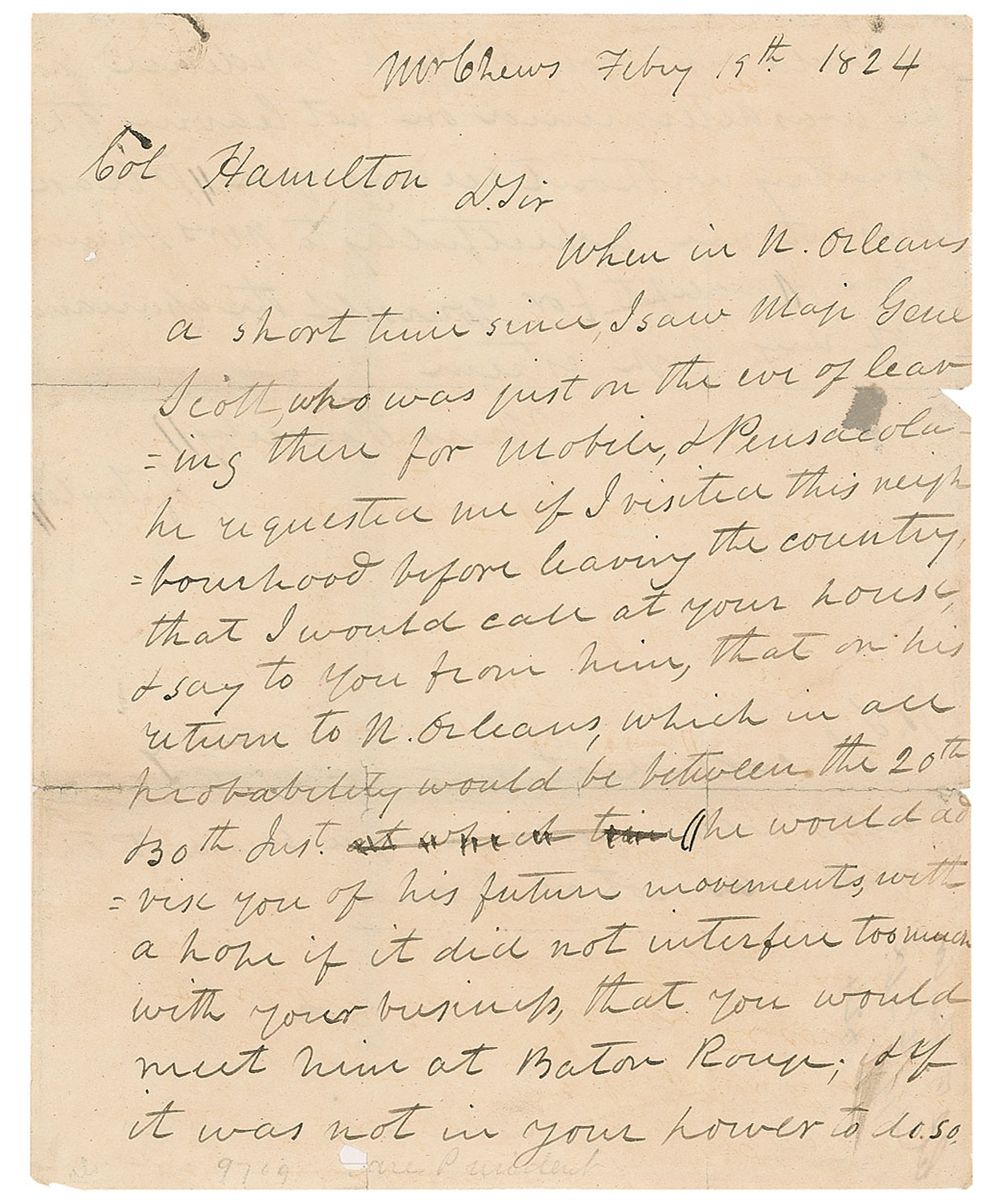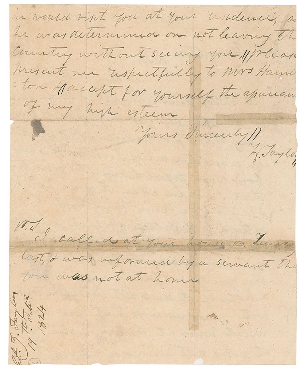 ALS signed “Z. Taylor,” one page both sides, 7.75 x 9.75, February 19, 1824. Taylor writes to a Colonel Hamilton. In part: “When in N. Orleans a short time since, I saw Majr. Genl. Scott, who was just on the eve of leaving there for Mobile & Pensacola. He requested me if I visited this neighbourhood before leaving the country, that I would call at your house & say to you from him, that on his return to N. Orleans…that you would meet him at Baton Rouge; & if it was not in your power to do so he would visit you at your residence, as he was determined on not leaving the country without seeing you.” He has added the postscript: “I called at your house on Tuesday last, & was informed by a servant that you was [sic] not at home.” Letter has been professionally inlaid to a slightly larger sheet. In very good condition, with intersecting folds, a few small holes in the paper, edge chips, smudges, and old tape reinforcement to three folds on the reverse. At the time, Taylor was assigned to a command at Baton Rouge, where General Winfield Scott visited on an inspection tour in January 1824. In addition to the message for Colonel Hamilton, Scott also brought word to Taylor that he had been ordered back to Louisville as superintendent of recruiting services. Surprised, Taylor nevertheless followed orders, settling his Louisiana affairs—including the delivery of this message—before leaving Baton Rouge five days later.