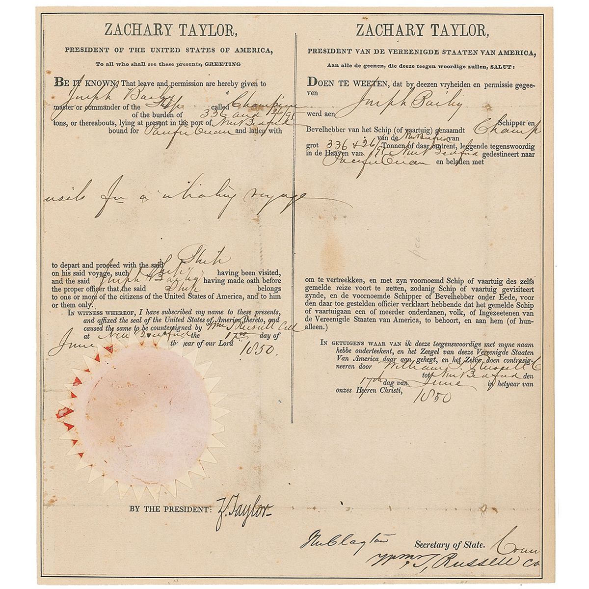 Partial partly-printed DS as president, signed “Z. Taylor,” one page, 8.75 x 10, June 17, 1850. Portion of a four-language ship’s pass containing the English and Dutch sections, issued to “Joseph Bailey master or commander of the Ship called Champion…lying at present in the port of New Bedford bound for the Pacific Ocean and laden with [ute]nsils for a whaling voyage.” Neatly signed at the conclusion by Taylor and countersigned by Secretary of State John M. Clayton. The embossed white paper seal affixed to the lower left remains crisp and fully intact. Affixed to a slightly larger mount. Smoothed intersecting folds passing through signature, insignificant surface marks and soiling, and some writing cut off at edges, otherwise fine condition.