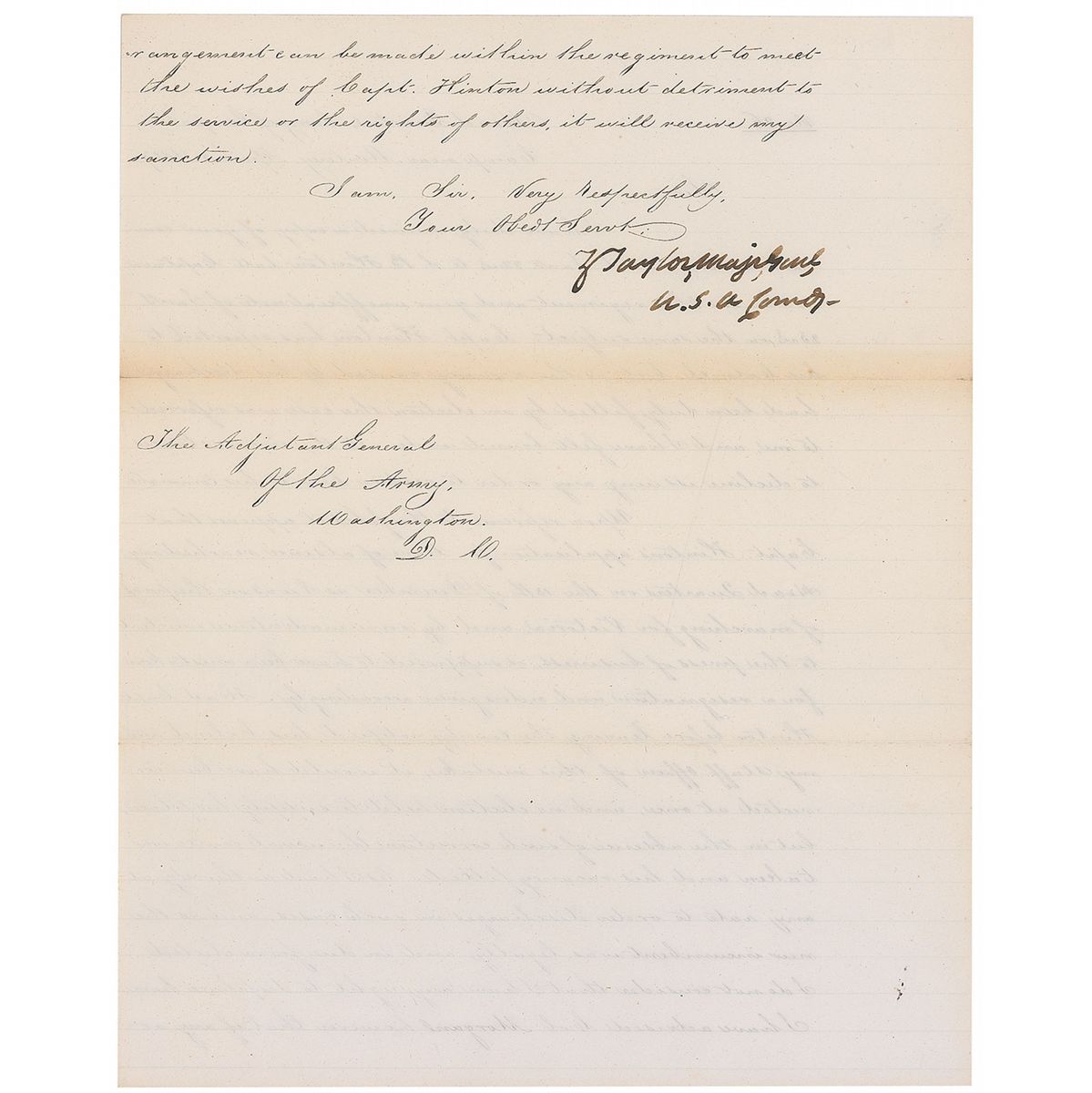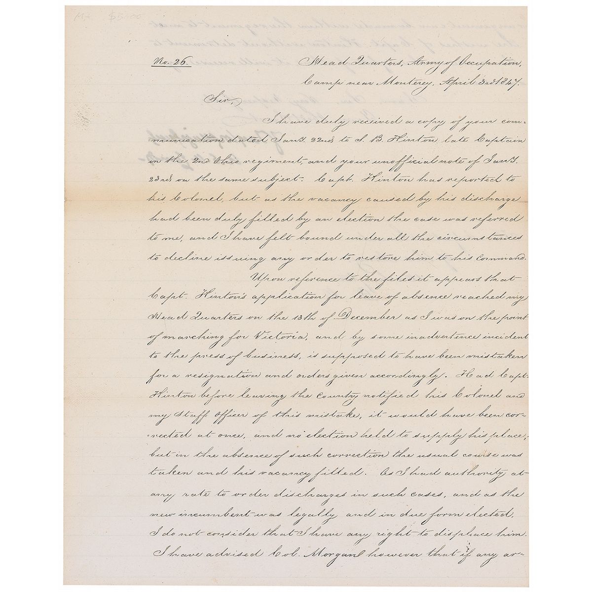 LS signed “Z. Taylor, Majr. Genl, U.S.A, Comdg,” one page, lightly-lined both sides, 8 x 9.75, April 3, 1847. Letter to Adjutant General of the Army Roger Jones. In full: “I have duly received a copy of your communication dated January 22nd to S.B. Hinton late Captain in the 2nd Ohio regiment [text is present] and your unofficial note of Jany 23rd on the same subject [text is present]. Capt. Hinton has reported to his Colonel, but as the vacancy caused by his discharge had been duly filled by an election the case was referred to me, and I have felt bound under all the circumstances to decline issuing any order to restore him to his command. Upon reference to the files it appears that Capt. Hinton’s application for leave of absence reached my Head Quarters on the 13th of December as I was on the point of marching for Victoria, and by some inadvertence incident to the press of business, is supposed to have been mistaken for a resignation and orders given accordingly. Had Capt. Hinton before leaving the country notified his Colonel and my staff officer of this mistake, it would have been corrected at once, and no election held to supply his place; but in the absence of such correction the usual course was taken and his vacancy filled. As I had authority at any rate to order discharges in such cases, and as the new incumbent was legally and in due form elected, I do not consider that I have any right to displace him. I have advised Col. Morgan however that if any arrangement can be made within the regiment to meet the wishes of Capt. Hinton without detriment to the services or the rights of others, it will receive my sanction.” In fine condition, with some mild toning along mailing folds. Captain Simon B. Hinton had written to Secretary of War William M. Marcy about his situation, telling him that he had applied for a leave of absence because of his health, but was instead discharged. Despite the fact Jones and Secretary of War Marcy authorized Taylor to reinstate Hinton, Taylor stood firm on his decision.