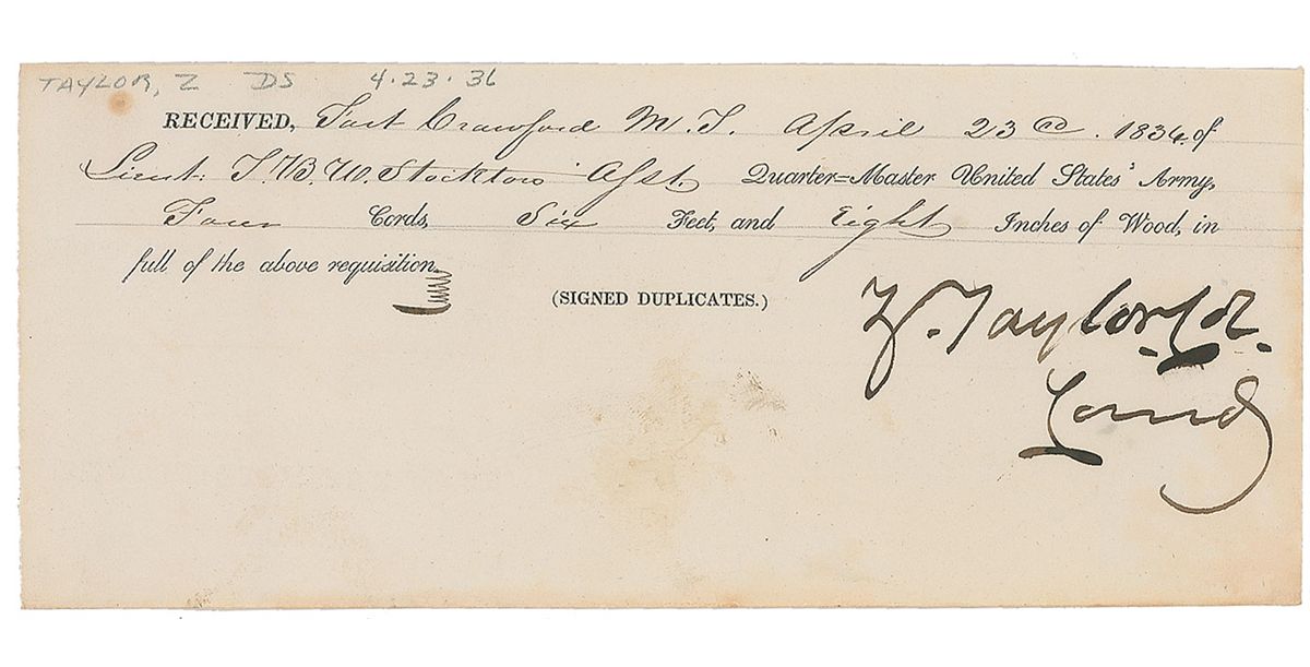 Choice partly-printed DS, signed “Z. Taylor, Col Comdg” one page, 7.75 x 3.25, April 23, 1836. Confirmation of the quartermaster’s receipt of “Four cords, Six Feet, and Eight Inches of Wood, in full of the above requisition.” In fine condition, with mild soiling.