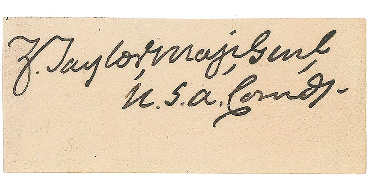 Very bold ink signature, “Z. Taylor, Majr Genl, U. S. A. Comdr,” on an off-white 3.5 x slip clipped from a larger document or letter. In fine condition.