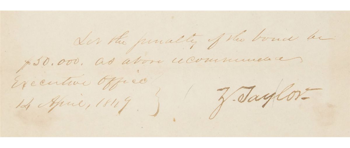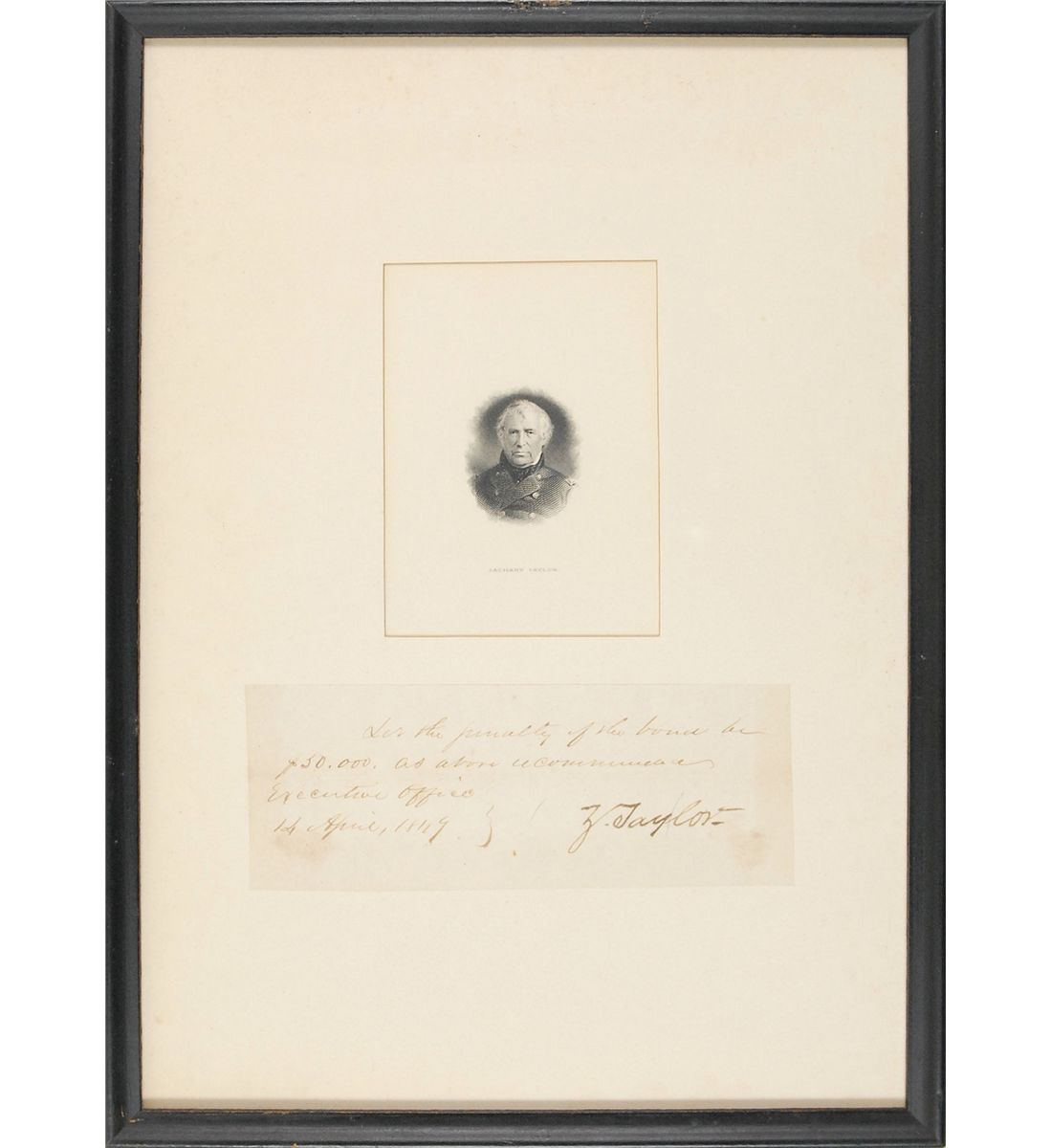 Partial-self-contained manuscript DS as president, signed “Z. Taylor,” one page, 6.75 x 2.5, April 14, 1849. Document reads, in full: “Let the penalty of the bond be $50,000 as above recommended.” Document is affixed to a 9.5 x 13.5 matted engraved portrait of Taylor and framed to an overall size of 10.75 x 14.5. A few small spots of toning from adhesive on reverse, otherwise fine condition.
