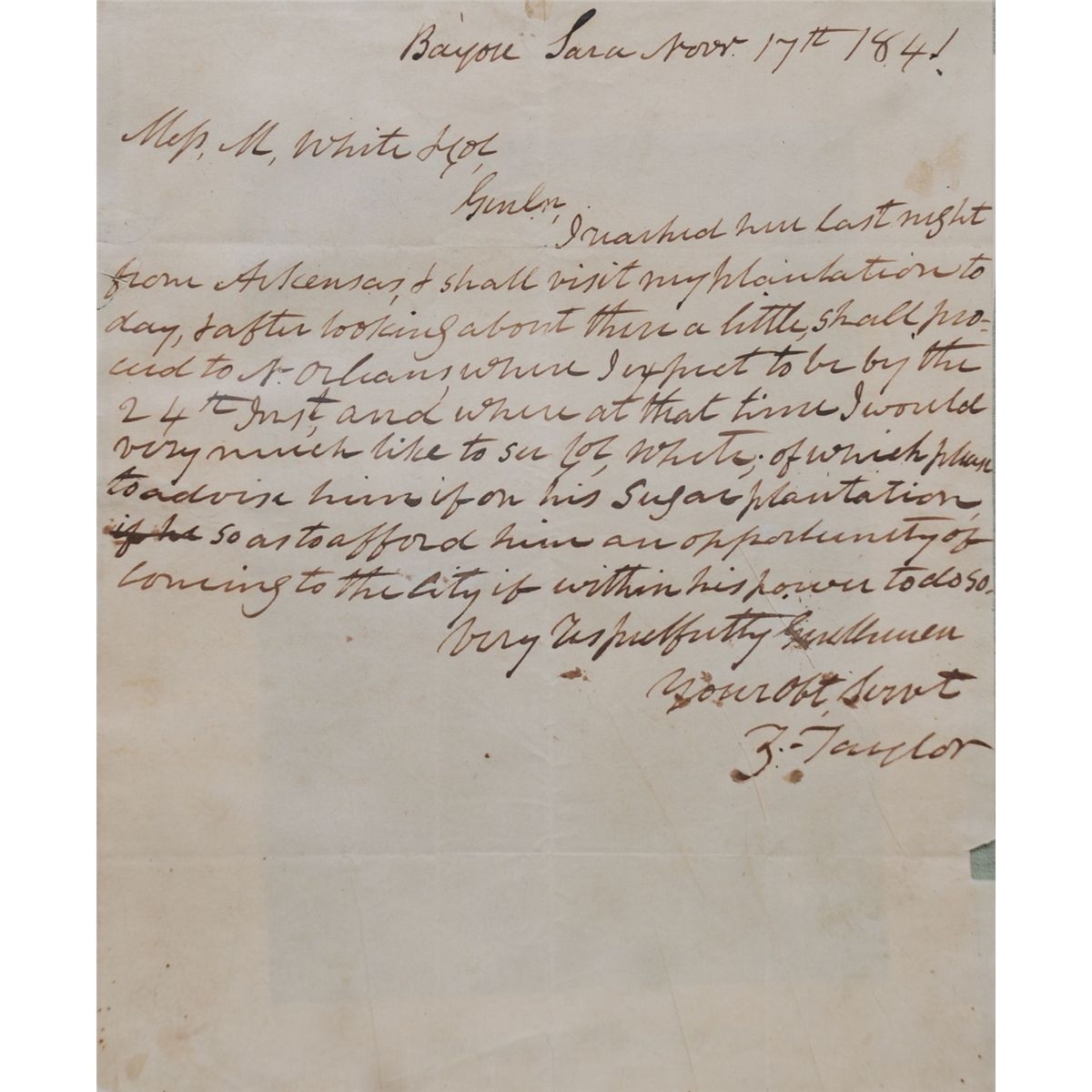 12th President of the U.S. ALS from Bayou Sara Nov. 17, 1841. Here Taylor writes to a merchant firm (Maunsel White) in New Orleans. He has arrived at his plantation from Arkansas and will be in New Orleans by the 24th, “and where at that time I would like to see Col. White; of which please to advise him if on his sugar plantation so as to afford him an opportunity of coming to the city if within his power to do so.” With a separate address leaf completed in Taylor’s hand. Wax seal remnants. Also included in this superb lot is a fine engraving of Taylor “at the period of his command in Mexico.” In Arkansas he was in command of the second department of the western division of the army at Fort Smith. He sold his Louisiana property a month after writing this letter.