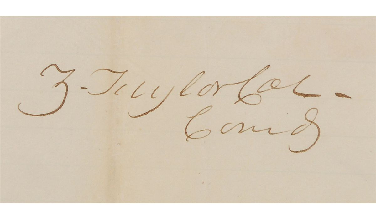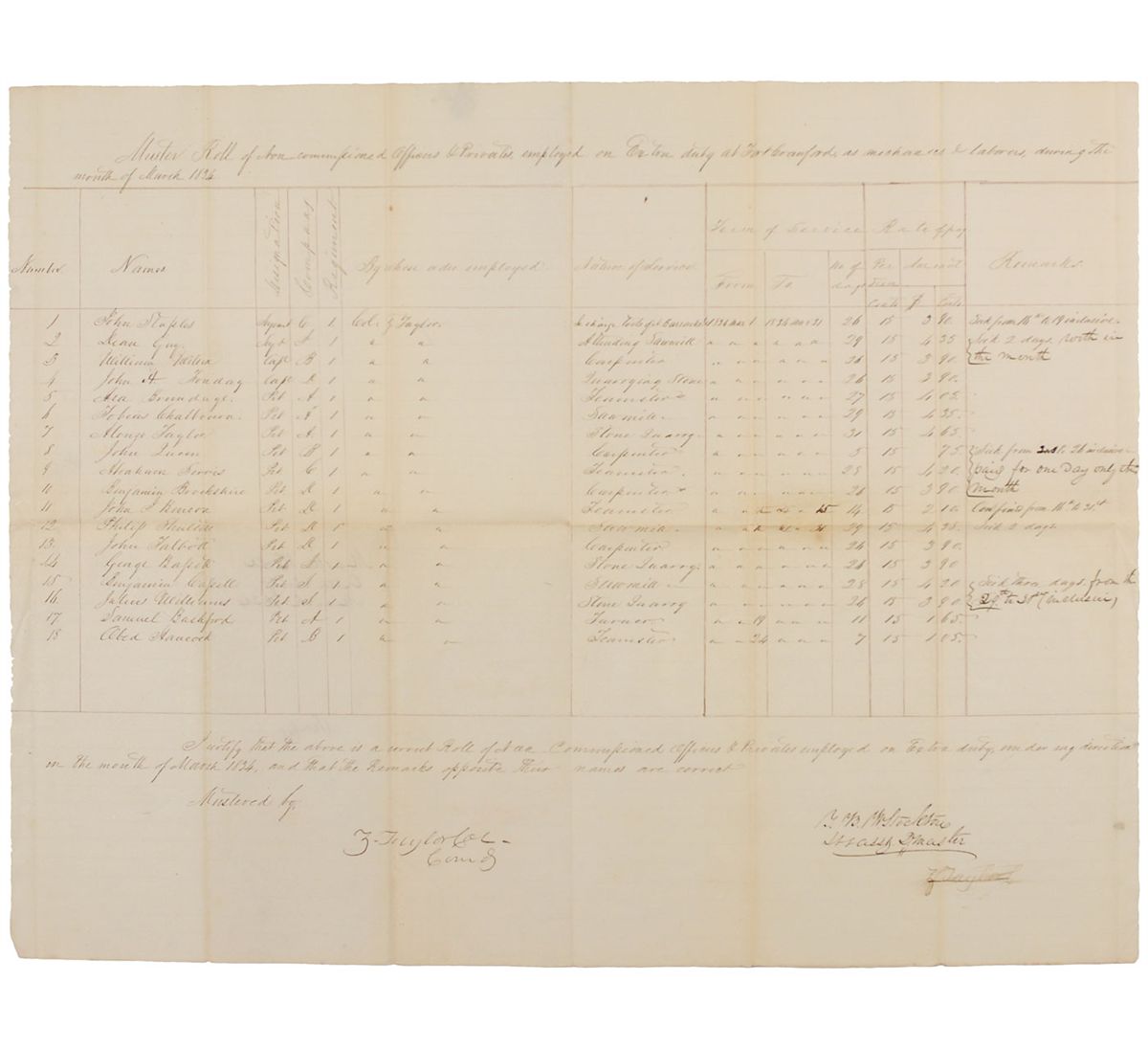 Manuscript DS, signed “Z. Taylor, Col Comdg,” one page, 20 x 15.75, March 1834. A muster roll headed “Muster Roll of non-commissioned Officers and Privates employed on Extra duty at Fort Crawford, as mechanics and laborers during the month of March 1834,” listing the names of 18 soldiers employed as laborers by Colonel Taylor, identifying their ranks, companies, and nature of service, including, “In charge of tools,” “Attending Sawmill,” “Carpenter,” “Quarrying Stone,” and “Teamster.” Signed at the conclusion by Taylor to certify the muster roll’s accuracy and countersigned by the assistant quartermaster. Intersecting folds with small holes at intersections (one vertical fold passing through a single letter of the signature), and light toning, otherwise fine condition. Fort Crawford was an outpost of the United States Army located in Prairie du Chien, Wisconsin, seated at the intersection of two of North America’s greatest water routes—the Mississippi and Wisconsin Rivers. Taylor commanded the fort from 1829 through 1837, only leaving when he was directed to Florida to participate in the Second Seminole War, where he served with distinction and earned the moniker ‘Old Rough and Ready.’
