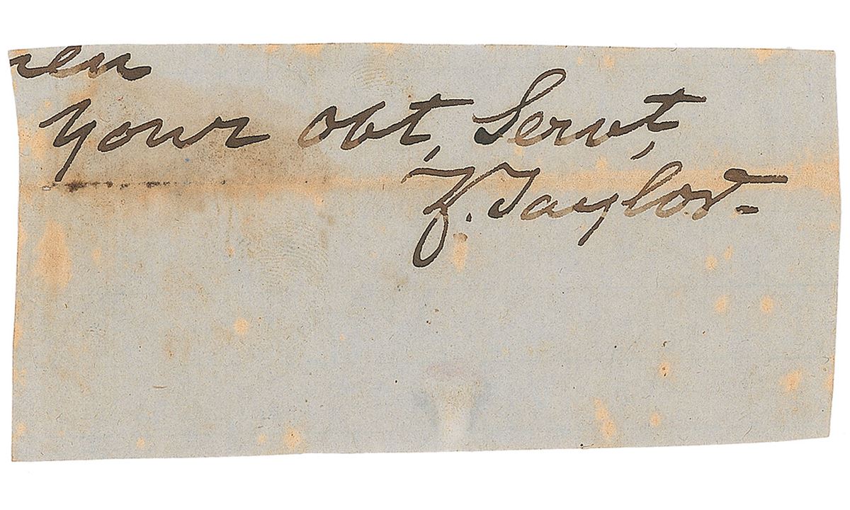 Ink signature, “Your obt. Servt, Z. Taylor,” on an off-white 3.75 x 2 slip clipped from a letter. In very good condition, with a toned horizontal fold (passing through the top of the signature), and scattered soiling and toning.