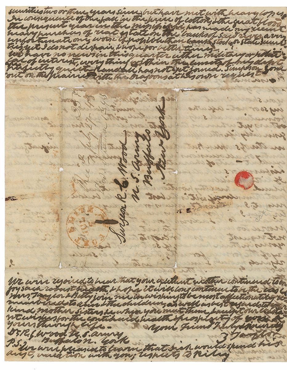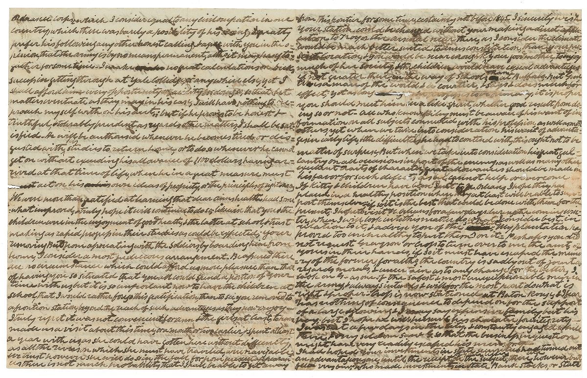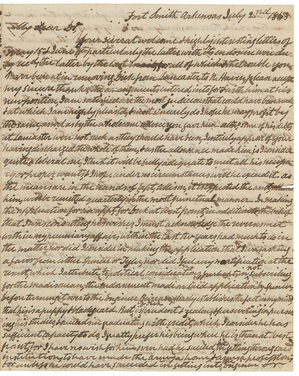 ALS signed “Z. Taylor,” four pages on two adjoining sheets, 8 x 10, July 2, 1843. Letter to Surgeon R. C. Wood of the US Army. Taylor begins by thanking him for “the trouble you have been at in removing Dick from Lancaster to N. Haven”—his son Dick had just transferred from Harvard to Yale. He goes on to discuss his failed attempt to get Dick an appointment at West Point, “I did [not] consider in making the application that I was asking a favor from either Spencer or Tyler, nor did I feel any mortification at the result, which I attribute to political considerations, perhaps in not subscribing for the Madisonian; the endorsement made on said application by Spencer, before turning it over to the Engineer Burian Marly establishes the fact in my mind, that his is a puppy & blackguard—but if Dick is prudent & persevering in pursuing his studies, & succeeds in graduating with credit, which I consider he has sufficient capacity to do, I greatly prefer his being where he is than at West Point; for I have no wish for him even had he succeeded in getting through said institution to have made the army a home & arms a profession; for unless he could have succeeded in getting into the engineer or ordnance corps, which I consider equal to any civil occupation in our country, which there was barely a possibility of his doing, I greatly prefer his following any other honest calling & agree with you in the opinion, that the army is by no means permanent, altho, it may hang together for some time…We have no news in this quarter either military or political of interest, everything within the limits of my department are perfectly quiet.” In very good condition, with partial separations to intersecting folds (affecting a few lines on the second integral sheet, light dampstaining, and show-through from writing to opposing sides. Accompanied by a full transcription. Richard Taylor went on to graduate from Yale in 1845 and became his father’s military secretary at the beginning of the Mexican-American War before returning to the family’s plantation; despite his father’s wishes that he not make “the army a home,” he did go on to become a Confederate general during the Civil War. Taylor letters of this length and boldness are rarely encountered.