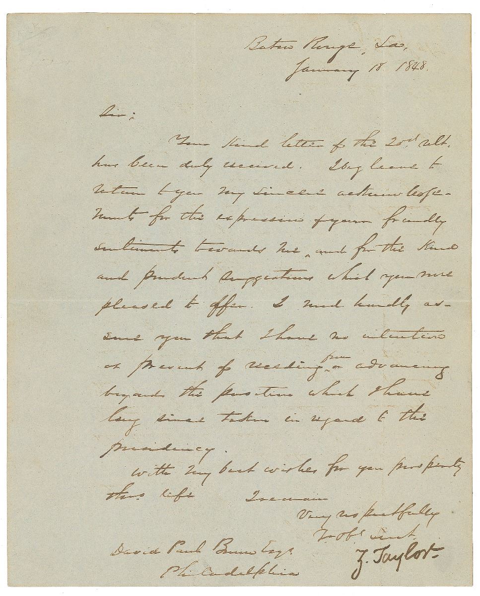 LS signed “Z. Taylor,” one page, 8 x 9.75, January 18, 1848. Letter to a gentleman in Philadelphia. In part: “I beg leave to return to my sincere acknowledgments for the expression of your friendly sentiments towards me, and for the kind and prudent suggestions which you were pleased to offer. I most kindly assure you that I have no intention at present of receding from or advancing beyond this position which I have long since taken in regard to the presidency.” In fine condition, with intersecting folds (one vertical fold passing through a single letter of the signature) and light wrinkling. Accompanied by an unsigned engraved portrait. Taylor had recently become a national hero for his success in the Mexican-American War and the public clamored for him to enter the 1848 presidential race. The Whig Party convinced the reluctant Taylor to lead their ticket, despite his unclear platform and lack of interest in politics—he had reportedly never revealed his political beliefs during his military career. His broad appeal drew votes from all across the political spectrum and his campaign proved successful in the November election.