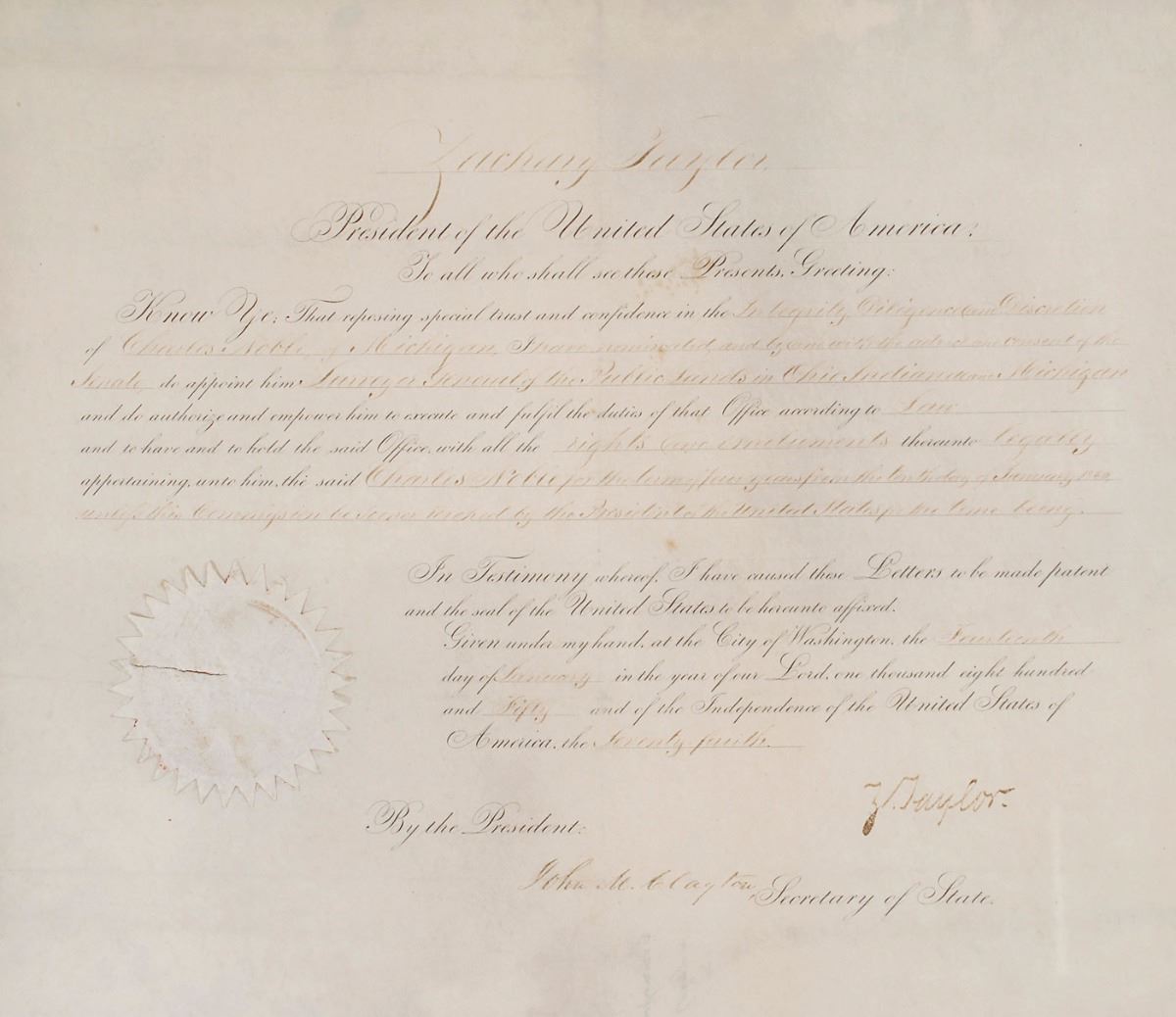 Partly-printed vellum DS as president, signed “Z. Taylor,” one page, 14.5 x 13, January 14, 1850. President Taylor appoints Charles Noble of Michigan as “Surveyor General of the Public Lands in Ohio, Indiana, and Michigan.” Prominently signed at the conclusion by President Taylor and countersigned by Secretary of State John M. Clayton. The white paper seal affixed to the lower left remains intact but cracked. Double-matted and framed with a color portrait of Taylor to an overall size of 25.75 x 18. In very good condition, with smoothed intersecting folds, scattered foxing, trivial flaking to ink in signature, and writing in the body light but legible. Long after earning nationwide recognition as a war hero, Taylor was inaugurated into presidential office on March 4, 1849. He suddenly died of illness less than sixteen months into his term, making him the third-shortest-serving American president and one of the rarer presidential autographs.