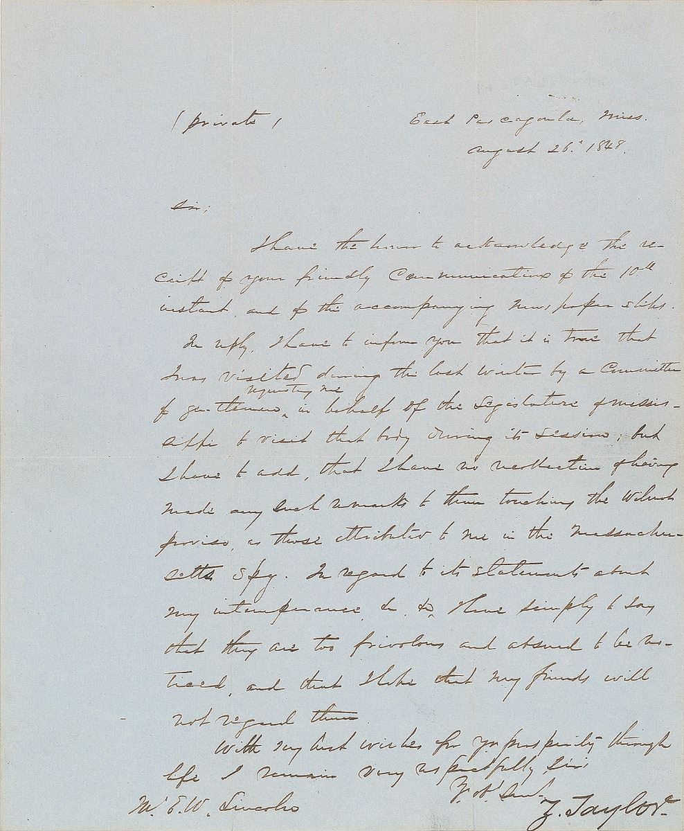 LS signed “Z. Taylor,” one page, 8.75 x 10.75, August 26, 1848. Letter to Mr. E. W. Lincoln, marked “private,” at the top. In full: “I have the honor to acknowledge the receipt of your friendly communication of the 10th instant, and of the accompanying newspaper slips. In reply, I have to inform you that it is true that I was visited during the last winter by a Committee of gentlemen requesting me in behalf of the Legislature of Mississippi to visit that body during its Session; but I have to add, that I have no recollection of having made any such remarks to them touching the Wilmot Proviso, as those attributed to me in the Massachusetts Spy. In regard to its statements about my intemperance, etc etc I have simply to say that they are too frivolous and absurd to be noticed, and that I hope that my friends will not regard them. With my best wishes for yr. prosperity through life.” In fine condition. Accompanied by the original transmittal envelope.