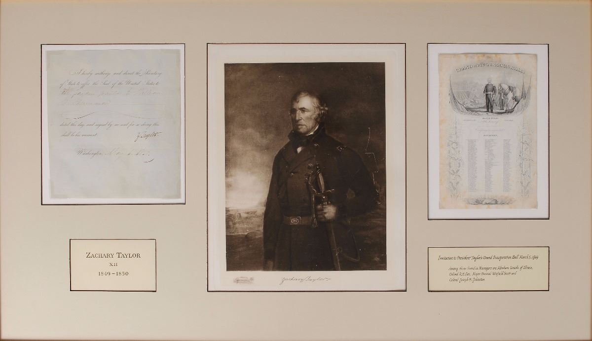 Very rare partly-printed DS as president, signed “Z. Taylor,” one page, 7.75 x 8.5, May 1, 1850. President Taylor directs “the Secretary of State to affix the Seal of the United States to the pardon granted to William C. Gumman.” Crisply signed at the conclusion in bold black ink. Impressively matted and framed along with an engraved portrait and scarce original printed invitation to Taylor’s inaugural ball to an overall size of 40 x 25.5. In very good to fine condition, with trimmed edges and a professionally repaired tear that once impinged on signature, now very unobtrusive. Taylor documents as president are generally scarce as he suddenly died of illness less than sixteen months into office. Pardons are even rarer, as he granted a mere thirty-eight during his term—the fifth fewest of any president.