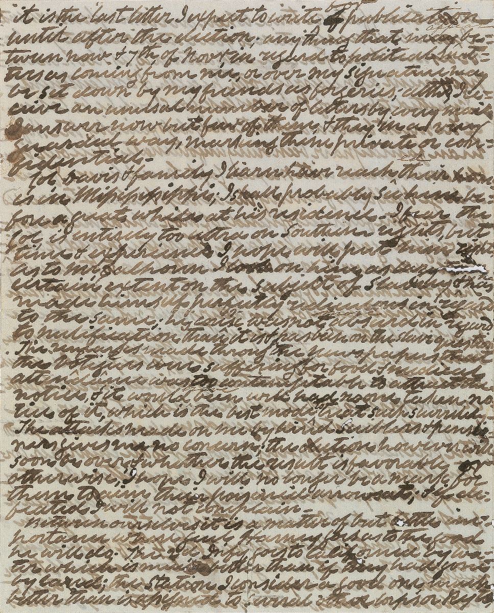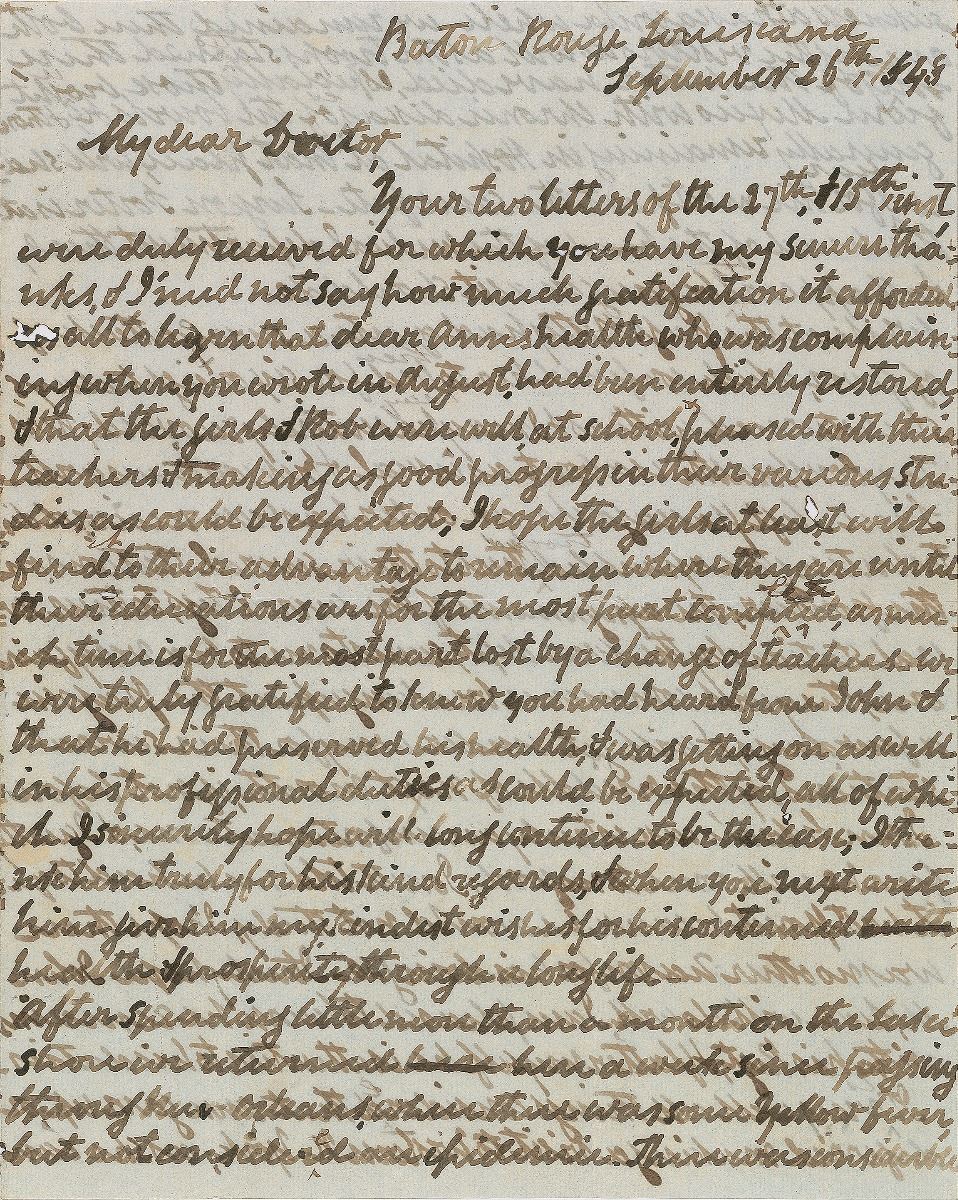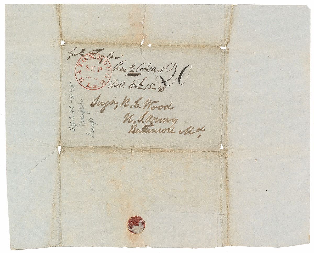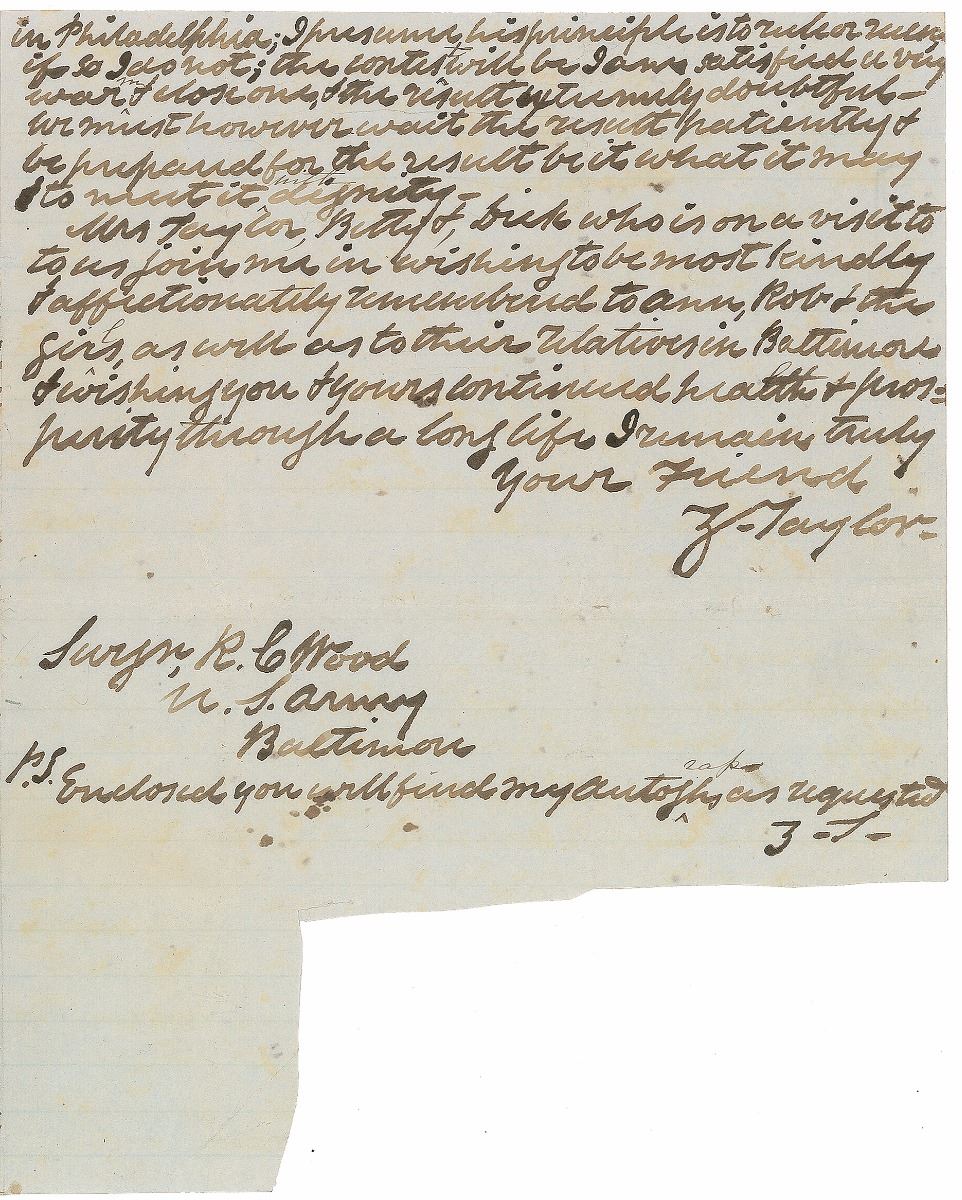 Incredible ALS signed “Z. Taylor,” seven pages on two sets of adjoining sheets, 7.75 x 9.75, September 26, 1848. Letter to Dr. R. C. Wood. In part: “Been a week since passing through New Orleans where there was some Yellow-fever, but not considered an epidemic. There was considerable sickness…both among the visitors as well as the troops stationed there many of the latter have died, especially those brought from Mexico with chronic diseases of the bowels &c, & those generally remaining in the Hospital at that place, will shall I fear for the most part the same fate. Surgeon Porter is at the head of the medical department there, & all appears to be going on as it should do. While at the pass Betty had quite a severe attack of fever, which confined her to her bed for six or eight days. She returned with us & I may say has entirely recovered; Mrs. Taylor’s health is about as usual, & Dick continues well. Since I left Pascagoula our order has been received distributing the assembled troops to their several stations on the frontier…I look on the result of the coming presidential election as very doubtful; the free soil movement with the recent split among the ultra Clay Whigs in New York answers anything but favorable to the Whig cause. The recent Whig meeting gotten up in the city of N. York by the Whigs for the purpose of bringing up Mr. C. before the country with the view of electing him, but to defeat me, they will all & a great many more of said party go over to Mr. Van Buren, & if they cannot elect him, they may defeat an election by the people & carry it into the House of Representatives, in which case no Whig can be elected; Whether Mr. Clay has [made] this move directly or not I am unable to say, but he has certainly done so indirectly which is as objectionable, by preserving silence in regard to my nomination since the adjournment of the Whig Convention in Philadelphia…The contest will be I am satisfied a very warm & close one, & the result extremely doubtful—we must however wait the result patiently & be prepared for the result be it what it may to meet it with dignity.” Includes the address leaf accomplished in Taylor’s hand. In very good to fine condition, with small areas of paper loss from ink erosion, clipped lower portion on last page, a tear to the separated address leaf, and Taylor’s heavy handwriting writing showing through from opposing sides.