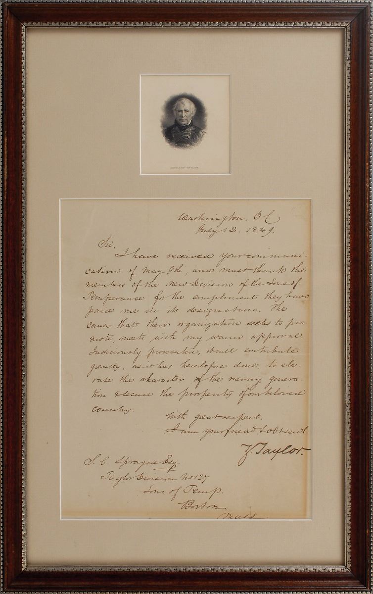 Rare LS as president signed “Z. Taylor,” one page, 7.5 x 10, July 12, 1849. Letter to S. C. Sprague at the Sons of Temperance, “Taylor Division No. 127.” In part: “I have received your communication…and must thank the members of the Division of the Sons of Temperance for the compliment they have paid me in its designation. The cause that their organization seeks to promote, meets with my warm approval. Judiciously prosecuted, it will contribute greatly, as it has heretofore done, to elevate the character of the rising generation & secure the prosperity of our beloved country.” Matted and framed with an engraved portrait to an overall size of 11.5 x 18. Reverse bears a Goodspeed’s Book Shop label. In fine condition, with intersecting folds and light uniform overall toning. Provenance: The Everett Fisher Collection.