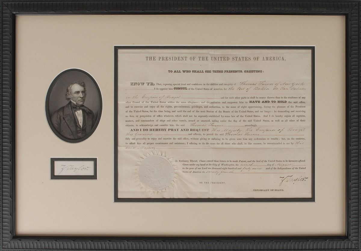 Rare partly-printed DS as president, signed “Z. Taylor,” one page, 13.25 x 10.25, August 9, 1849. President Taylor appoints Thomas Turner of New York as “Consul of the United States of America, for the Port of Bahia de San Salvador in the Empire of Brazil.” Signed at the conclusion by Taylor. The embossed white paper seal affixed to lower remains crisp and fully intact. Double-matted and framed with an engraving and facsimile signature to an overall size of 25 x 17.5. In overall fine condition, with several intersecting folds to document. Taylor documents as president are generally scarce as he suddenly died of illness less than sixteen months into office.