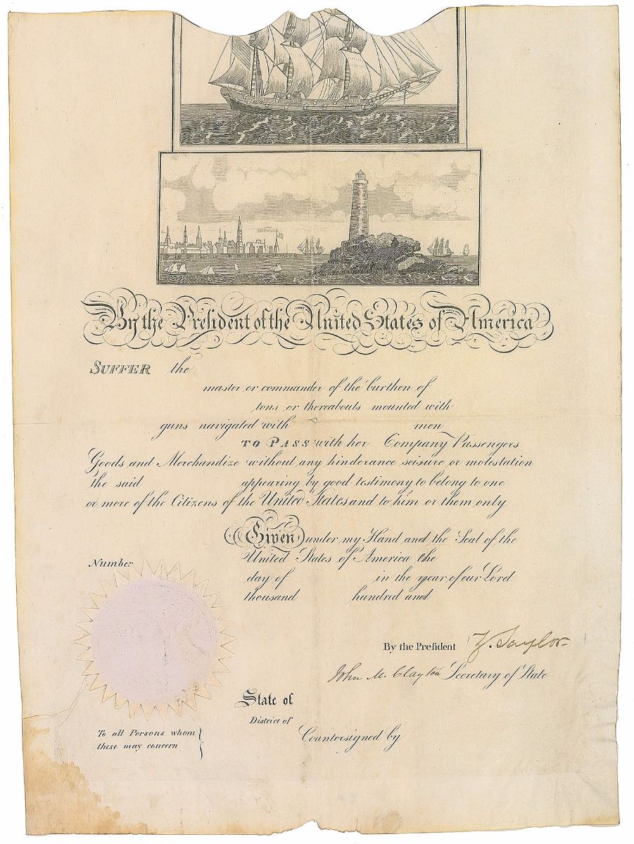 Desirable partly-printed vellum DS as president, signed “Z. Taylor,” one page, 11.5 x 16, no date. Unissued scallop-topped ship’s pass, boldly signed at the bottom by Taylor, and countersigned by Secretary of State John Clayton. The white wafer seal is intact. In fine condition, with a small hole at the intersection of folds, a bit of paper loss at the bottom edge, and lights staining to the lower left corner. Any Taylor presidential document is quite uncommon, as he served only 16 months before he died suddenly on July 9, 1850.