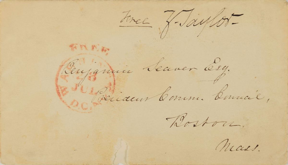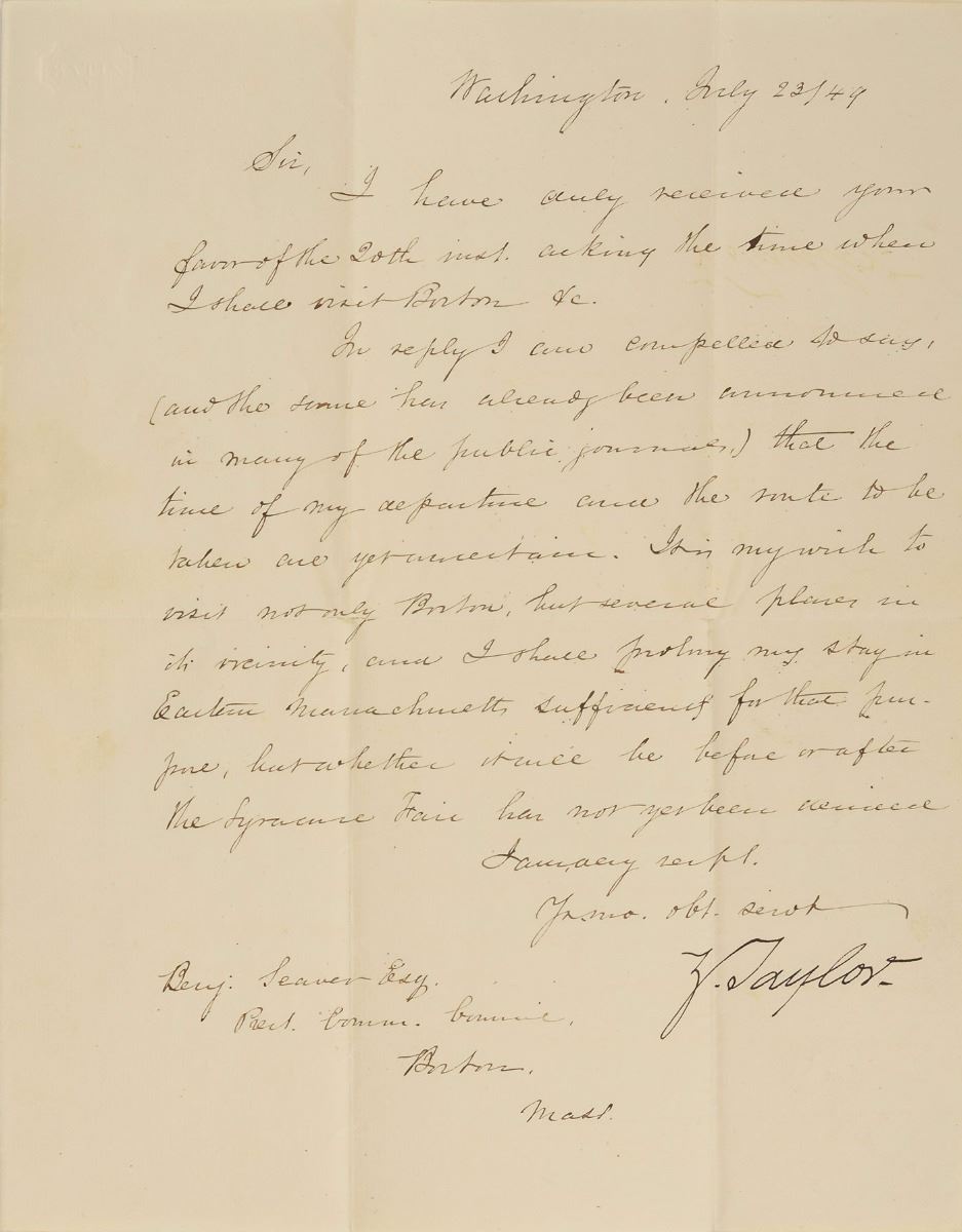 Scarce LS as president signed “Z. Taylor,” one page, 8 x 10, July 23, 1849. Letter to Benjamin Seaver, in part: "I have only received your favor of the 20th inst. asking the time when I shall visit Boston etc. In reply I am compelled to say, (and the same has already been announced in in many of the public journals), that the time of my departure and the route to be taken are yet uncertain. It is my wish to visit not only Boston, but several places in its vicinity, and I shall prolong my stay in Eastern Massachusetts sufficient for that purpose, but whether it will be before or after the Syracuse Fair." In fine condition. Accompanied by the original mailing envelope, franked in the upper right by the president, "Z. Taylor." Taylor as president is uncommon across all formats, as he served only 16 months before he died suddenly on July 9, 1850; this example, with additional free franked envelope, boasts an ideally bold, crisp signature.