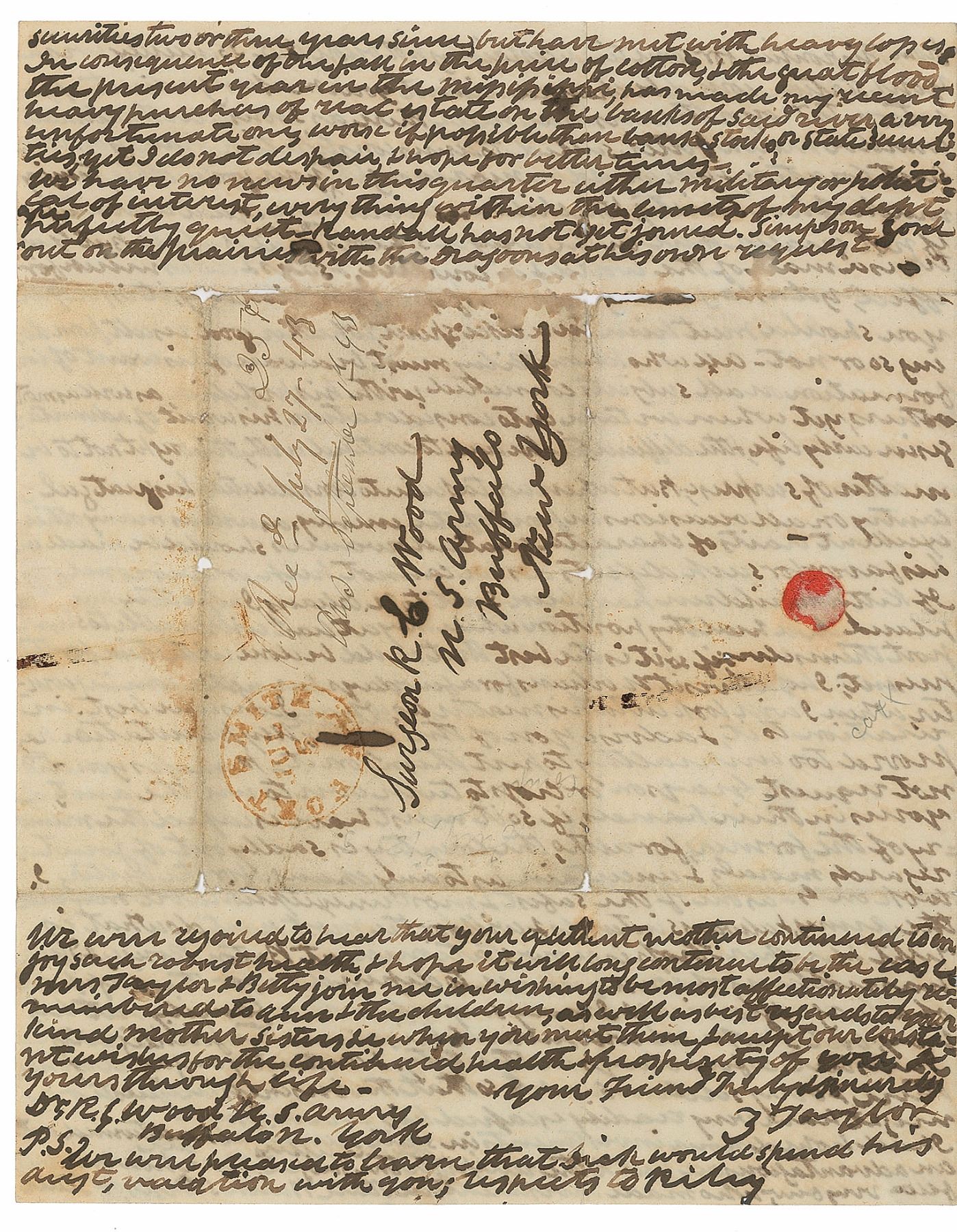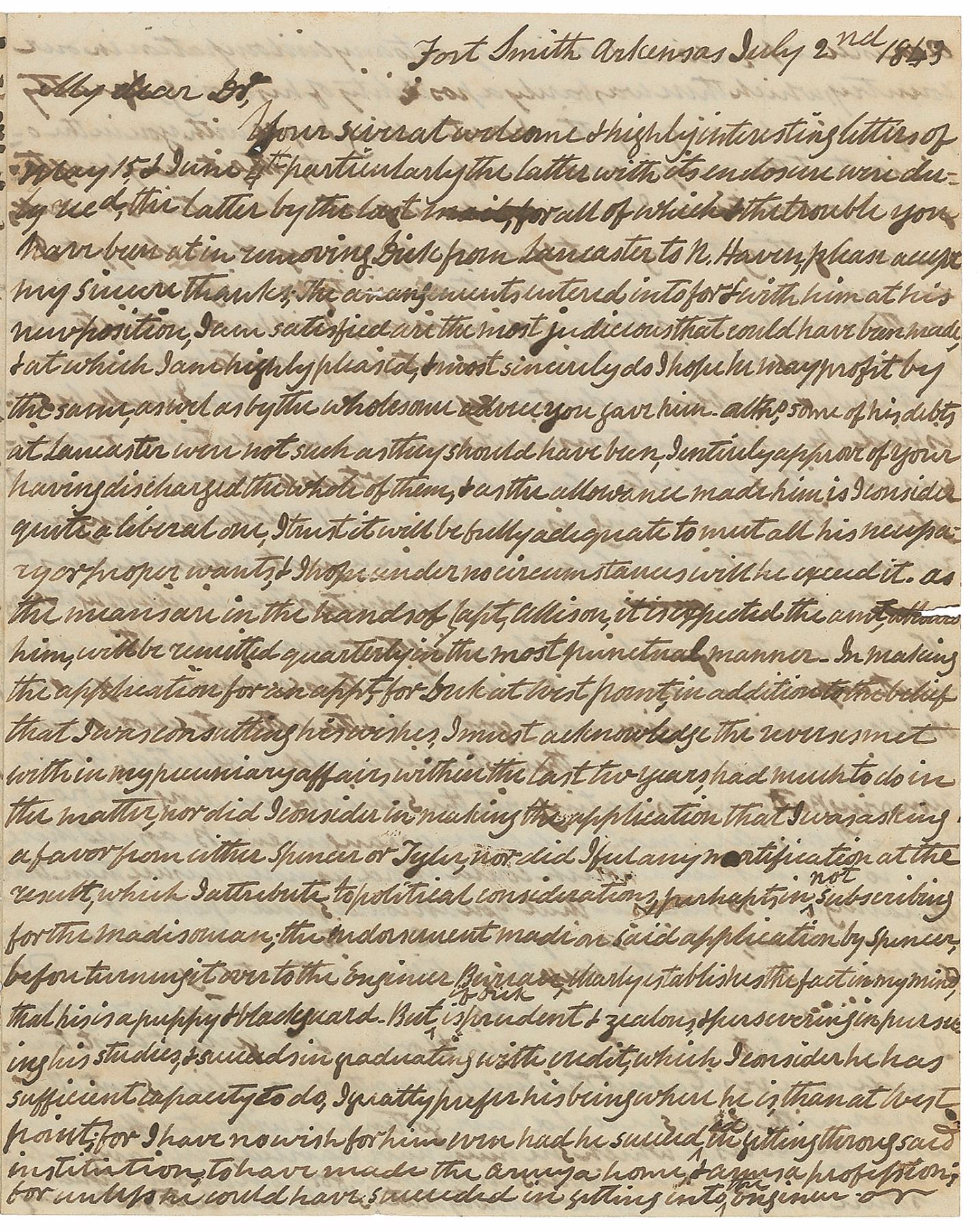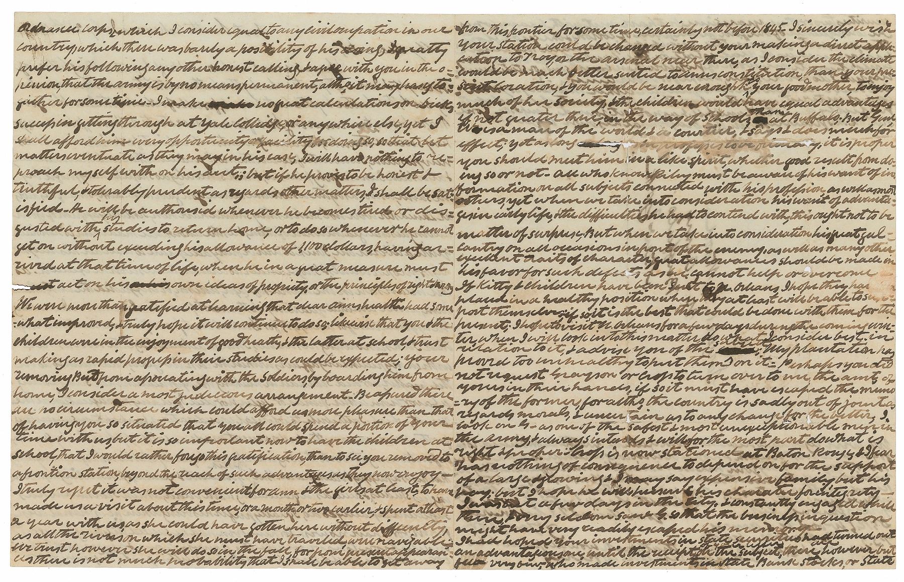 ALS signed “Z. Taylor,” four pages on two adjoining sheets, 8 x 10, July 2, 1843. Letter to Surgeon R. C. Wood of the US Army. Taylor begins by thanking him for “the trouble you have been at in removing Dick from Lancaster to N. Haven”—his son Dick had just transferred from Harvard to Yale. He goes on to discuss his failed attempt to get Dick an appointment at West Point, “I did [not] consider in making the application that I was asking a favor from either Spencer or Tyler, nor did I feel any mortification at the result, which I attribute to political considerations, perhaps in not subscribing for the Madisonian; the endorsement made on said application by Spencer, before turning it over to the Engineer Burian Marly establishes the fact in my mind, that his is a puppy & blackguard—but if Dick is prudent & persevering in pursuing his studies, & succeeds in graduating with credit, which I consider he has sufficient capacity to do, I greatly prefer his being where he is than at West Point; for I have no wish for him even had he succeeded in getting through said institution to have made the army a home & arms a profession; for unless he could have succeeded in getting into the engineer or ordnance corps, which I consider equal to any civil occupation in our country, which there was barely a possibility of his doing, I greatly prefer his following any other honest calling & agree with you in the opinion, that the army is by no means permanent, altho, it may hang together for some time…We have no news in this quarter either military or political of interest, everything within the limits of my department are perfectly quiet.” In very good condition, with repairs to small areas of paper loss along intersecting folds (affecting a few lines on the second integral sheet, light dampstaining, and show-through from writing to opposing sides. Accompanied by a full transcription. Richard Taylor went on to graduate from Yale in 1845 and became his father’s military secretary at the beginning of the Mexican-American War before returning to the family’s plantation; despite his father’s wishes that he not make “the army a home,” he did go on to become a Confederate general during the Civil War. Taylor letters of this length and boldness are rarely encountered.