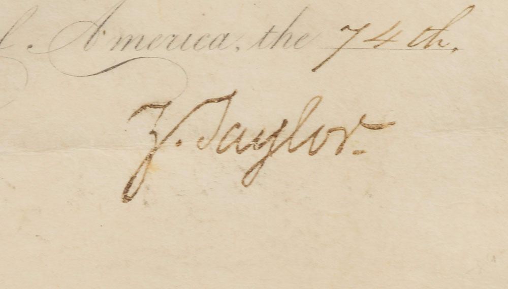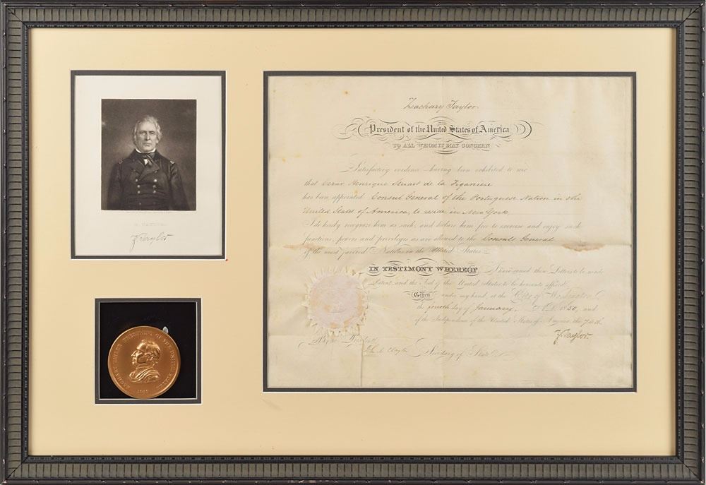 Partly-printed DS as president, signed “Z. Taylor,” one page, 15 x 12.75, January 4, 1850. Diplomatic commission in which President Taylor recognizes the appointment of Cezar Henrique Stuart de la Figaniere as "Consul general of the Portuguese Nation in the United States of America, to reside in New York." Signed at the conclusion by Taylor, and countersigned by Secretary of State John M. Clayton. Lower left retains original white paper seal. Double-matted and framed with a commemorative medallion and an engraved portrait to an overall size of 29 x 20. In very good to fine condition, with a bit of foxing, and some staining along one of the moderate intersecting folds; medallion within frame off-center but capable of being easily fixed.