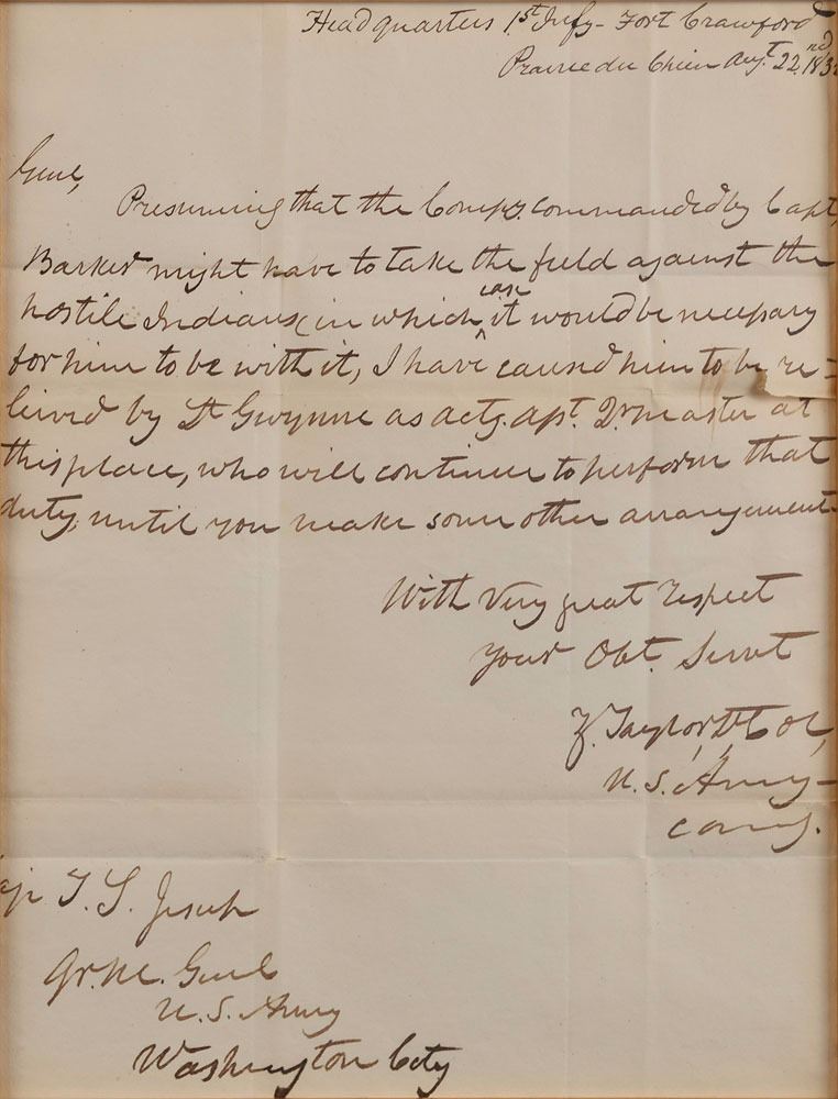 ALS signed “Z. Taylor, Lt. Col., U. S. Army Comdg,” one page, 7.25 x 9.5, August 22, 1832. Letter to Captain Thomas Jesup, in full, “Presuming that the Compy Commanded by Capt. Barker might have to take the field against the hostile Indians (in which case it would be necessary for him to be with it, I have caused him to be relieved by Lt. Gwynne as Actg. Asst. Qr. Master at this place, who will continue to perform that duty, until you make some other arrangement.” Matted and framed with two engraved plaques and a portrait of Taylor to an overall size of 23.5 x 20.5. In very good to fine condition, with several intersecting folds, and a tear to the right edge barely touching the text. Known as the 'Father of the Modern Quartermaster Corps,' Jesup served 52 years in the military, one of the longest in the history of the United States Army. In 1836, Jesup was placed in command of all US troops in Florida during the Second Seminole War.