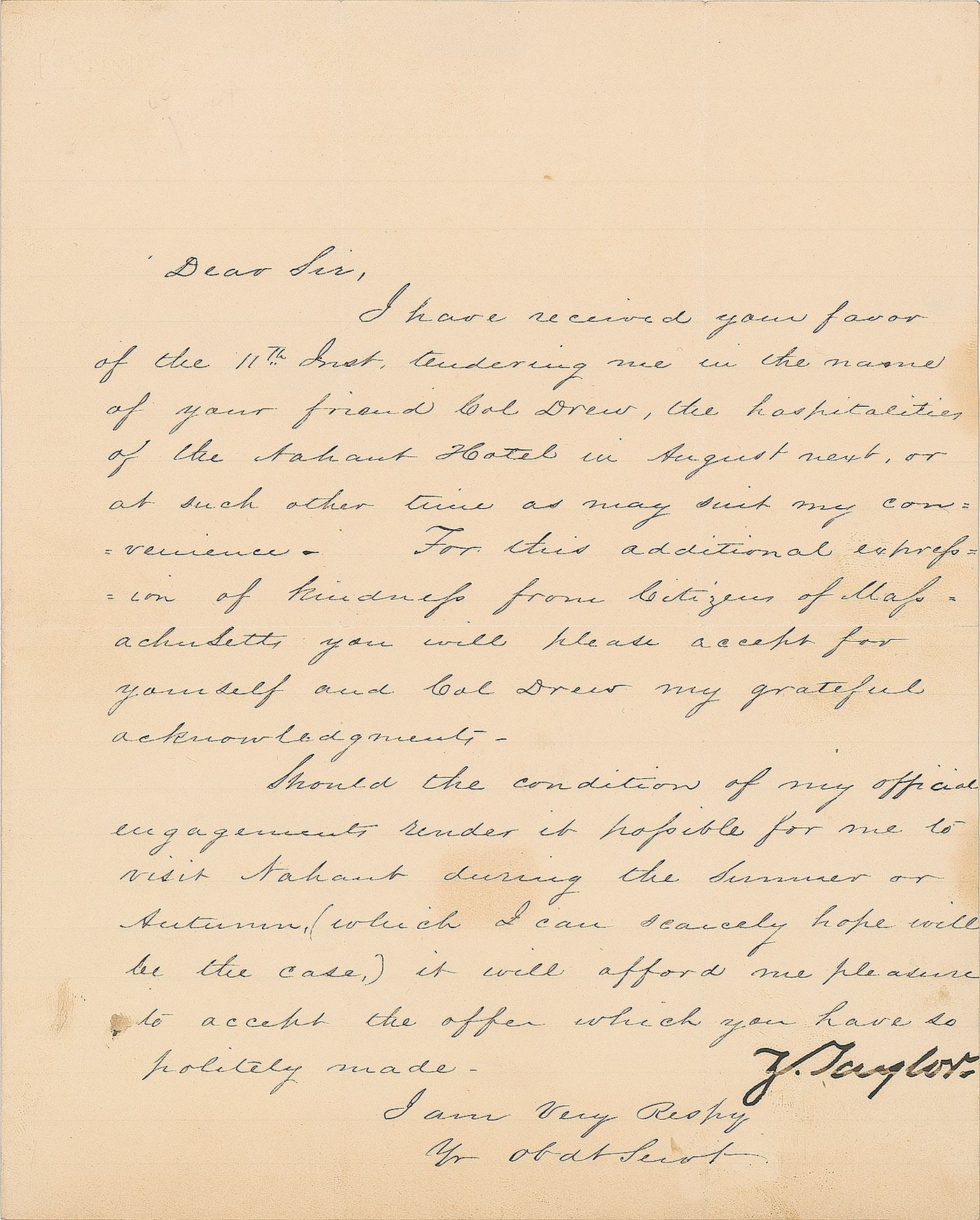 LS signed “Z. Taylor,” one page, 8 x 10, no date. Letter to a gentleman, in full: "I have received your favor of the 11th Inst. tendering me in the name of your friend Col. Drew, the hospitalities of the Nahant Hotel in August next, or at such other time as may suit my convenience. For this additional expression of kindness from Citizens of Massachusetts you will please accept for yourself and Col. Drew my grateful acknowledgments. Should the condition of my official engagements render it possible for me to visit Nahant during the Summer or Autumn, (which I can scarcely hope will be the case,) it will afford me pleasure to accept the offer which you have so politely made." In fine condition, with a few faint stains. Accompanied by an engraved portrait bearing a facsimile signature. Though it lacks a place or date, this is very likely a scarce letter as president—Taylor would have had few "official engagements" prior to his presidency, and it resembles known letters dating to his sixteen months in the White House.