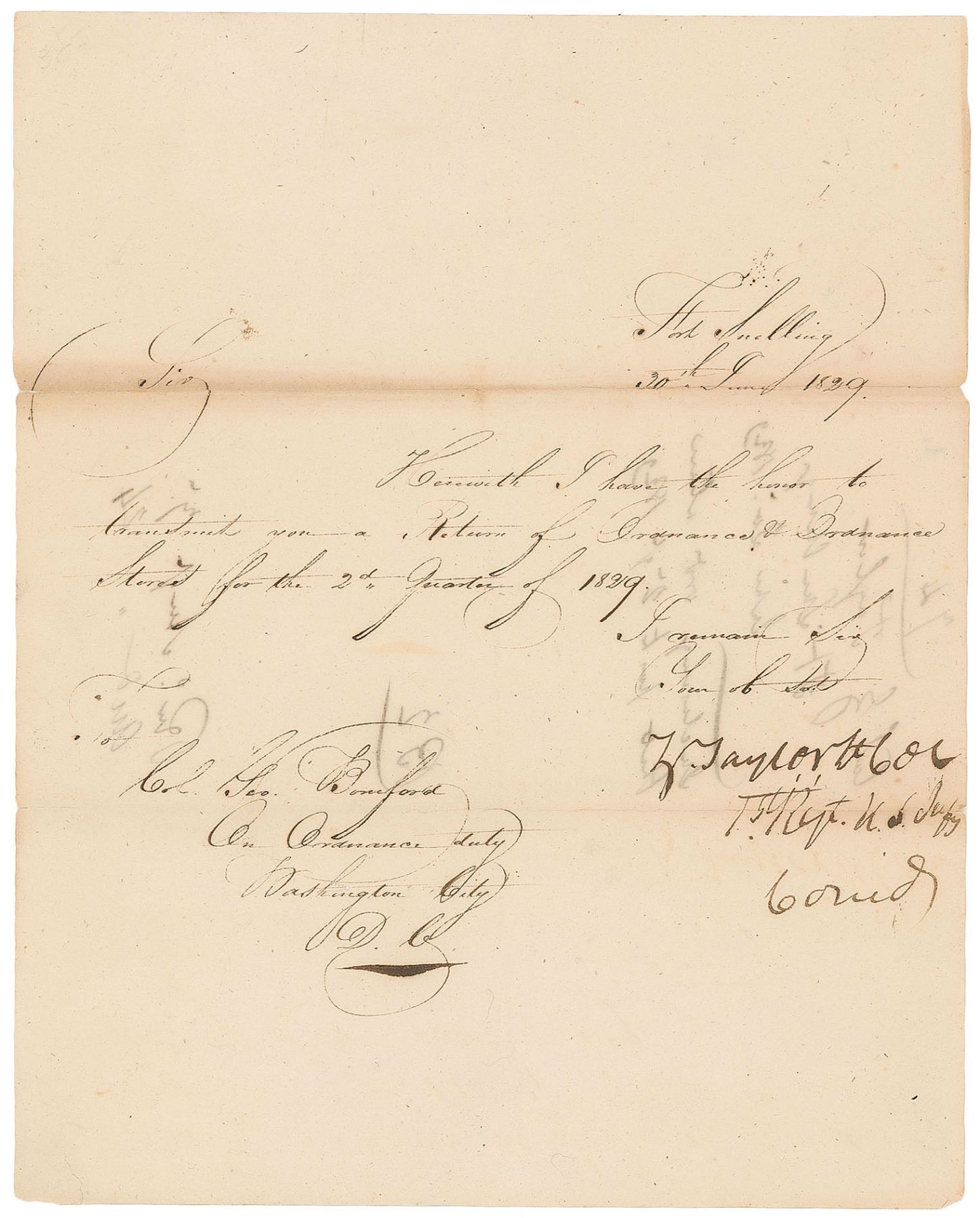 Manuscript DS, signed “Z. Taylor, Lt. Col.,” one page, 7.75 x 9.75, June 30, 1829. Letter issued to Col. George Bomford, in full: "Herewith I have the honor to transmit you a Return of Ordnance & Ordnance Stores for the 2d Quarter of 1829." Boldly signed at the conclusion by Taylor. In fine condition, with light toning along, and professional reinforcements to, the two horizontal folds.