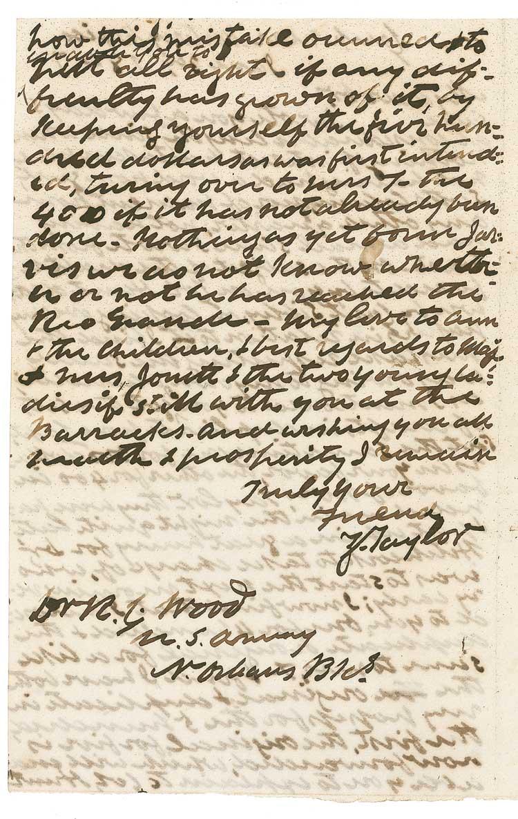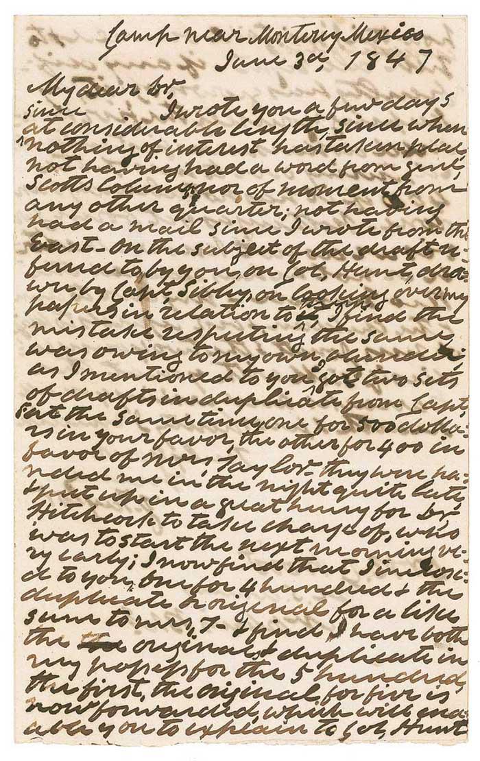 “On the subject of the draft refund to you, on Col. Hunt drawn on Capt. Sibley, on looking over my papers in relation to it I find the mistake respecting the sum was owing to my own blunder; as I mentioned to you I got two sets of drafts in duplicate from Cpt S Taylor. They were handed me in the night quite late and put up in a great hurry for Dr. Hitchcock to take charge of, who was to start the next morning very early; I now find that I inclosed to you one for 4 hundred & the duplicate or original for a like sum to Mrs. T & find I have both original & duplicate in my possession for the 5 hundred, the first, the original for five is now forwarded, which will enable you to explain to Col. Hunt how this mistake occurred to enable you to act all right – if any difficulty has grown of it by keeping yourself the five hundred dollars as was first intended, turning over to Mrs. T. the 400 if it has not already been done.