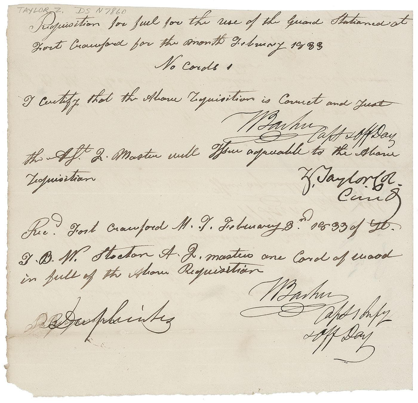 Manuscript DS, signed “Z. Taylor, Col Cmdg.,” one page, 8 x 7.5, February 1833. Taylor signs off on a requisition for fuel for the guard at Fort Crawford. In very good to fine condition, with trimmed top edge, scattered mild toning along one of the horizontal folds, one fold touching top of a couple letters of signature, a few creases, and missing lower left corner tip. Taylor’s signature is bold and prominent.