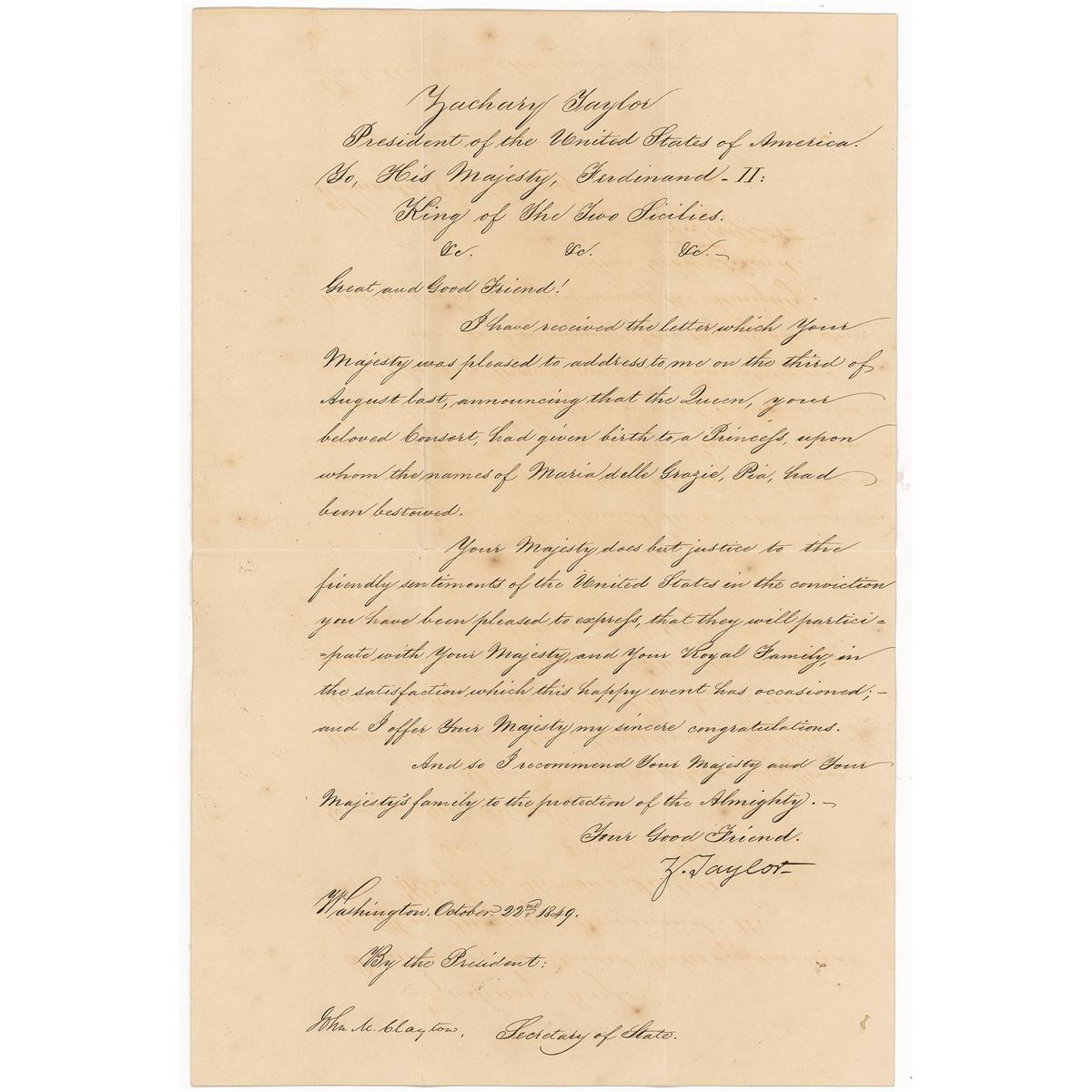 Manuscript DS as president, signed “Z. Taylor,” one page, 10.75 x 16.5, October 22, 1849. An official letter of state sent to the King of Two Sicilies, Ferdinand II. In full: “I have received the letter which Your Majesty was pleased to address to me on the third of August last, announcing that the Queen, your beloved Consort, had given birth to a Princess, upon whom the name of Maria delle Grazie, Pia, had been bestowed. Your Majesty does but justice to the friendly sentiments of the United States in the conviction you have been pleased to express, that they will participate with Your Majesty, and Your Royal Family, in the satisfaction which this happy event has occasioned; – and I offer Your Majesty my sincere congratulations. And so I recommend Your Majesty and Your Majesty’s family to the protection of the Almighty.” Signed at the conclusion by Taylor and countersigned by Secretary of State John Clayton. Intersecting folds, one through a single letter of signature, a uniform shade of light toning, and light mirroring of ink , otherwise fine condition. Letter also has three small cuts on blank integral second page. Accompanied by the original 9 x 4 transmittal envelope, bearing a complete 2.5 inch embossed seal of the United States on the reverse, addressed in another hand to Ferdinand. Envelope has several cuts to both sides, and uniform toning to front.