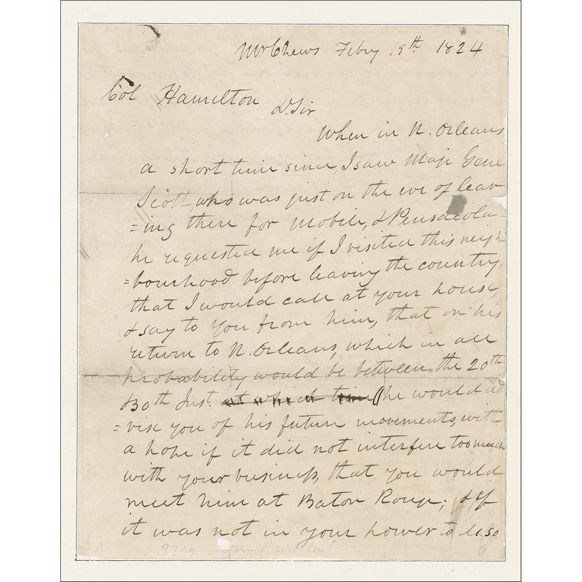 ALS signed “Z. Taylor,” one page both sides, 7.75 x 9.75, February 19, 1824. Taylor writes to a Colonel Hamilton. In part: “When in N. Orleans a short time since, I saw Majr. Genl. Scott, who was just on the eve of leaving there for Mobile & Pensacola. He requested me if I visited this neighbourhood before leaving the country, that I would call at your house & say to you from him, that on his return to N. Orleans…that you would meet him at Baton Rouge; & if it was not in your power to do so he would visit you at your residence, as he was determined on not leaving the country without seeing you.” He has added the postscript: “I called at your house on Tuesday last, & was informed by a servant that you was [sic] not at home.” In very good condition, with intersecting folds, a few small holes in the paper, edge chips, smudges, old tape reinforcement to three fold lines on the back, and professionally inlaid into a slightly larger sheet.