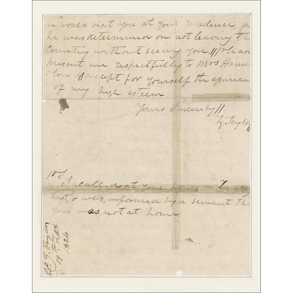 At the time, Taylor was assigned to a command at Baton Rouge, where General Winfield Scott visited on an inspection tour in January 1824. In addition to the message for Colonel Hamilton, Scott also brought word to Taylor that he had been ordered back to Louisville as superintendent of recruiting services. Surprised, Taylor nevertheless followed orders, settling his Louisiana affairs—including the delivery of this message—before leaving Baton Rouge five days later.