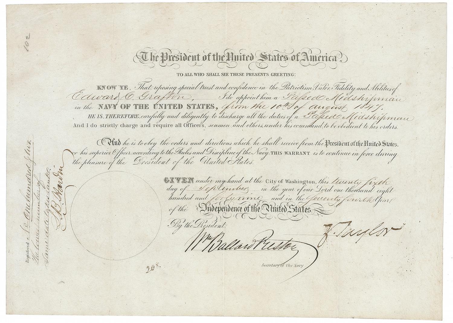 Partly-printed DS as president, signed “Z. Taylor,” one vellum page, 11 x 8, September 26, 1849. President Taylor appoints Edward Grafton a “Passed Midshipman in the Navy of the United States.” Signed at the conclusion by Taylor and countersigned by Secretary of the Navy William B. Preston. In fine condition, with four vertical folds, one through a single letter of signature, and a couple trivial brushes to signature. Grafton, as flag-officer of the frigate Minnesota when the Confederate vessel Merrimac tried to raise the Union blockade, participated in the ensuing engagement at Hampton Roads. He later commanded the steam gunboat Genesee and participated in the bombardment of Fort Morgan. After the war he was placed in Command of the Gettysburg in the North Atlantic. A most elusive format, with an exceptional association, from this president who occupied the White House for little over a year before dying in office.