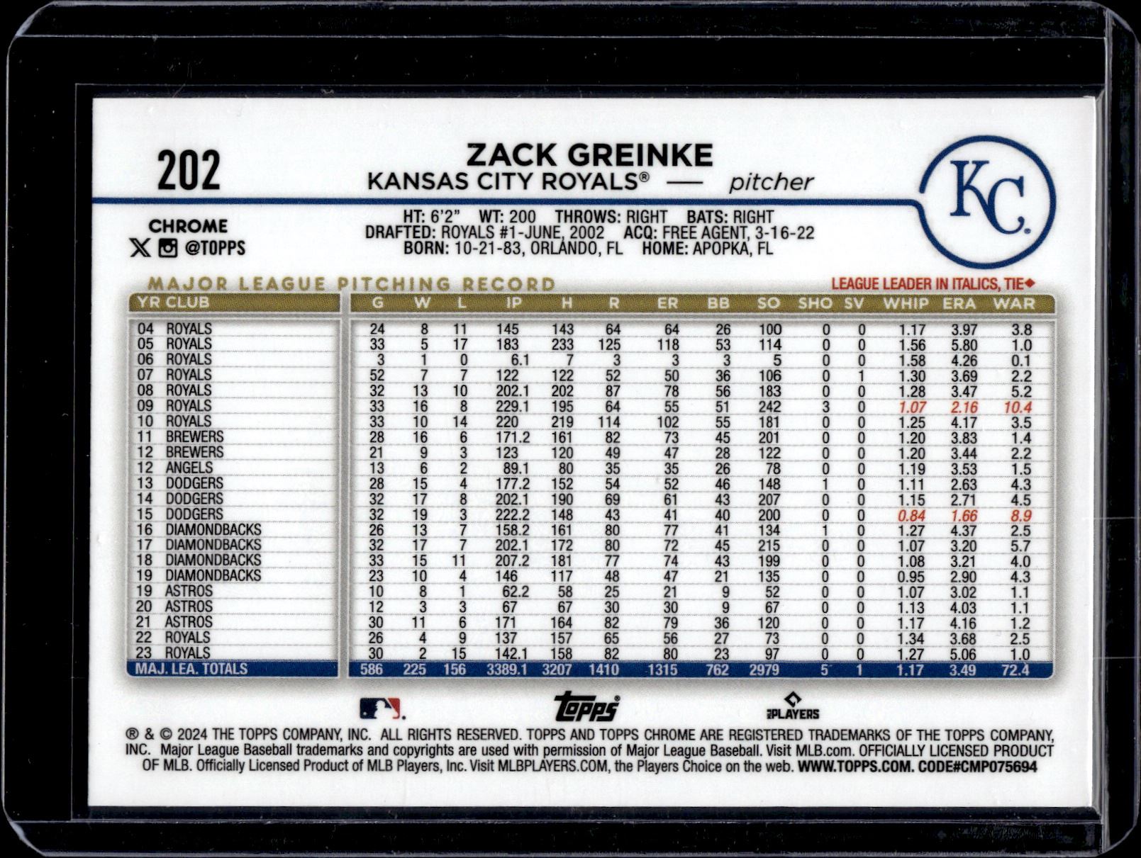 Zack Greinke Blue Raywave Refractor /150 2024 Topps Chrome #202